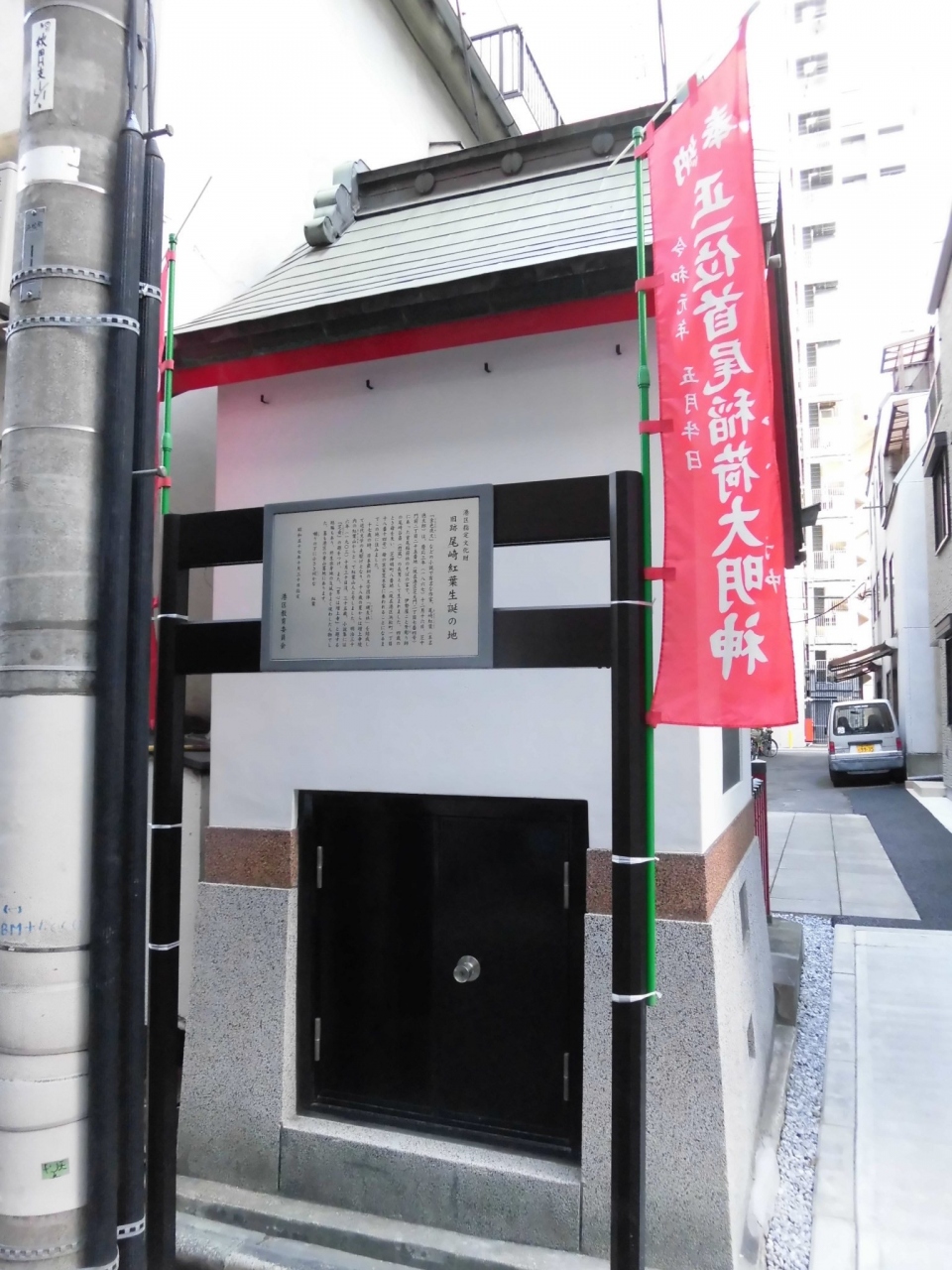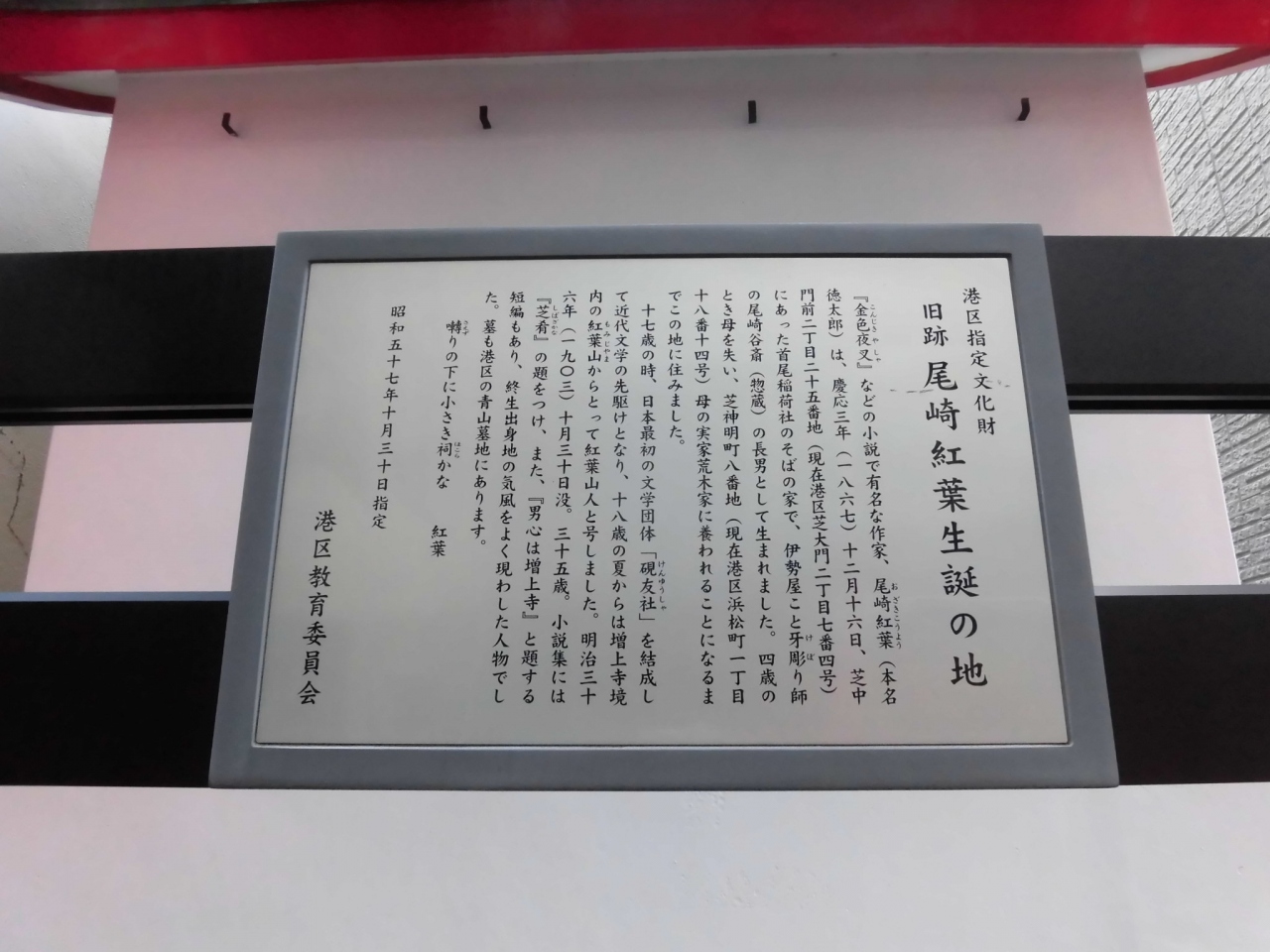 首尾稲荷大明神という芝大門の稲荷神社にお参りしたときに、お社の裏側に案内板があるのに気が付きました。この場所が金色夜叉で有名な尾崎紅葉生誕の地だと記した案内板でした。生家の痕跡などはありませんが、神社と一体になったような場所だったので、とても意外な場所で驚いてしまいました。