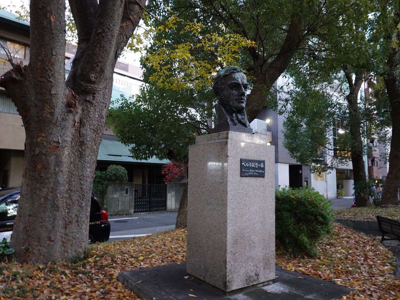 増上寺と日比谷通りを挟んで向かい合う芝公園の飛び地に「ペルリ提督の像」があります。一般的には黒船来航の「ペリー提督」の名前でお馴染みの、アメリカ海軍の軍人です。頭像ですが、その凛々しい風貌には西洋人ならではのものを感じます。周囲に積もった落ち葉も印象的でした。