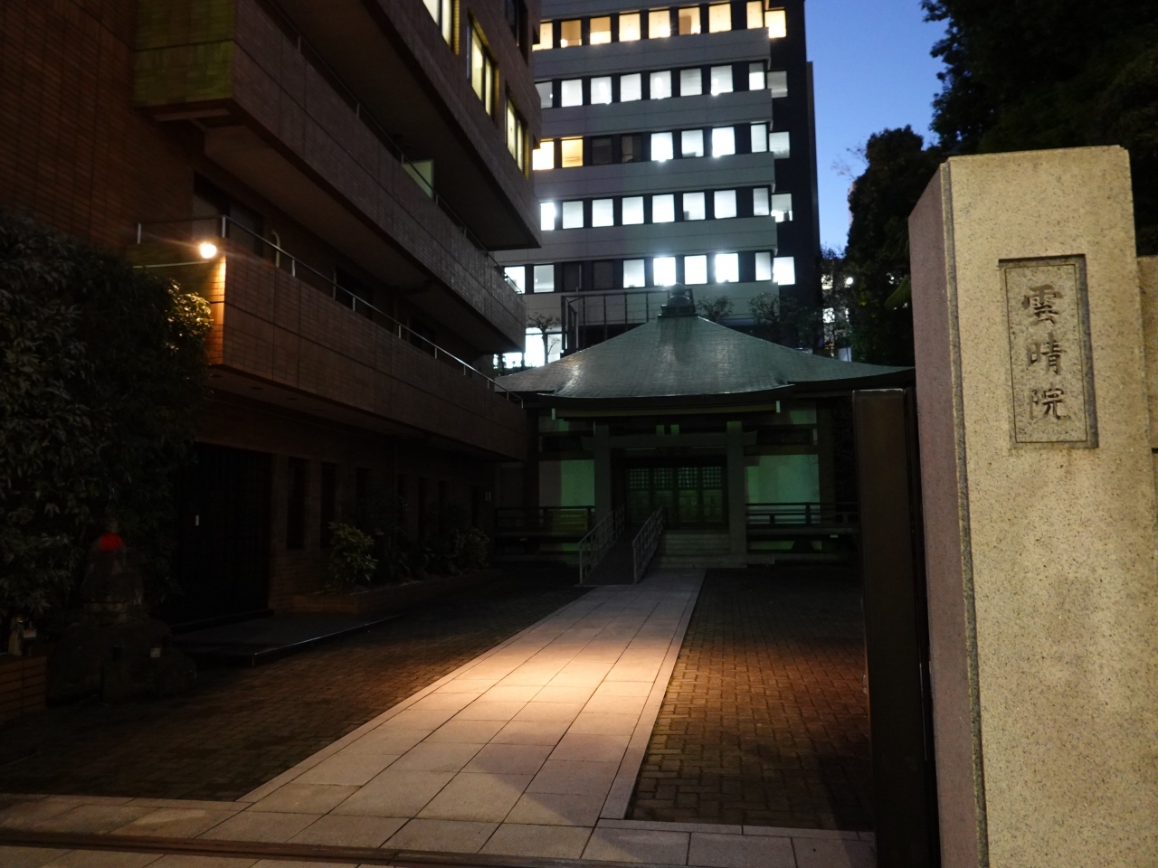 芝公園を散策したあと、宿泊ホテルの「ザ・プリンス パークタワー東京」に戻る途中に通りかかったお寺です。雲晴院は、寛永10年に建立された浄土宗寺院で、増上寺にゆかりのあるお寺です。境内は整然とした美しさがありましたが、本堂に至る石畳の片側にマンションらしき建物があり、風情はあまり感じられませんでした。