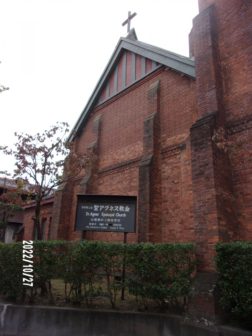 この日本聖公会・聖アグネス教会は烏丸通りに面しています。京都市営地下鉄烏丸線丸太町駅から北に5分弱の場所です。この聖アグネス教会はプロテスタント系のものです。19世紀末に活動が始まりました。そして平成女学院の聖堂として創建されました。現在は地域の信者たちにも開放されています。レンガ造りのゴシック様式の教会です。場所も含めて存在感があります。