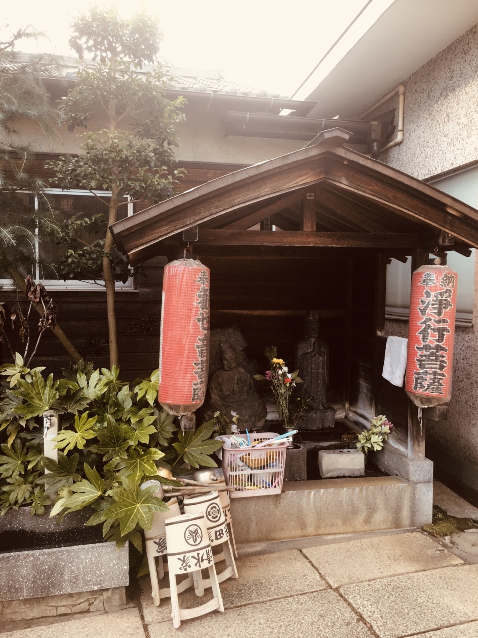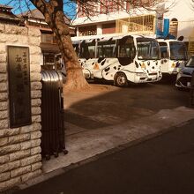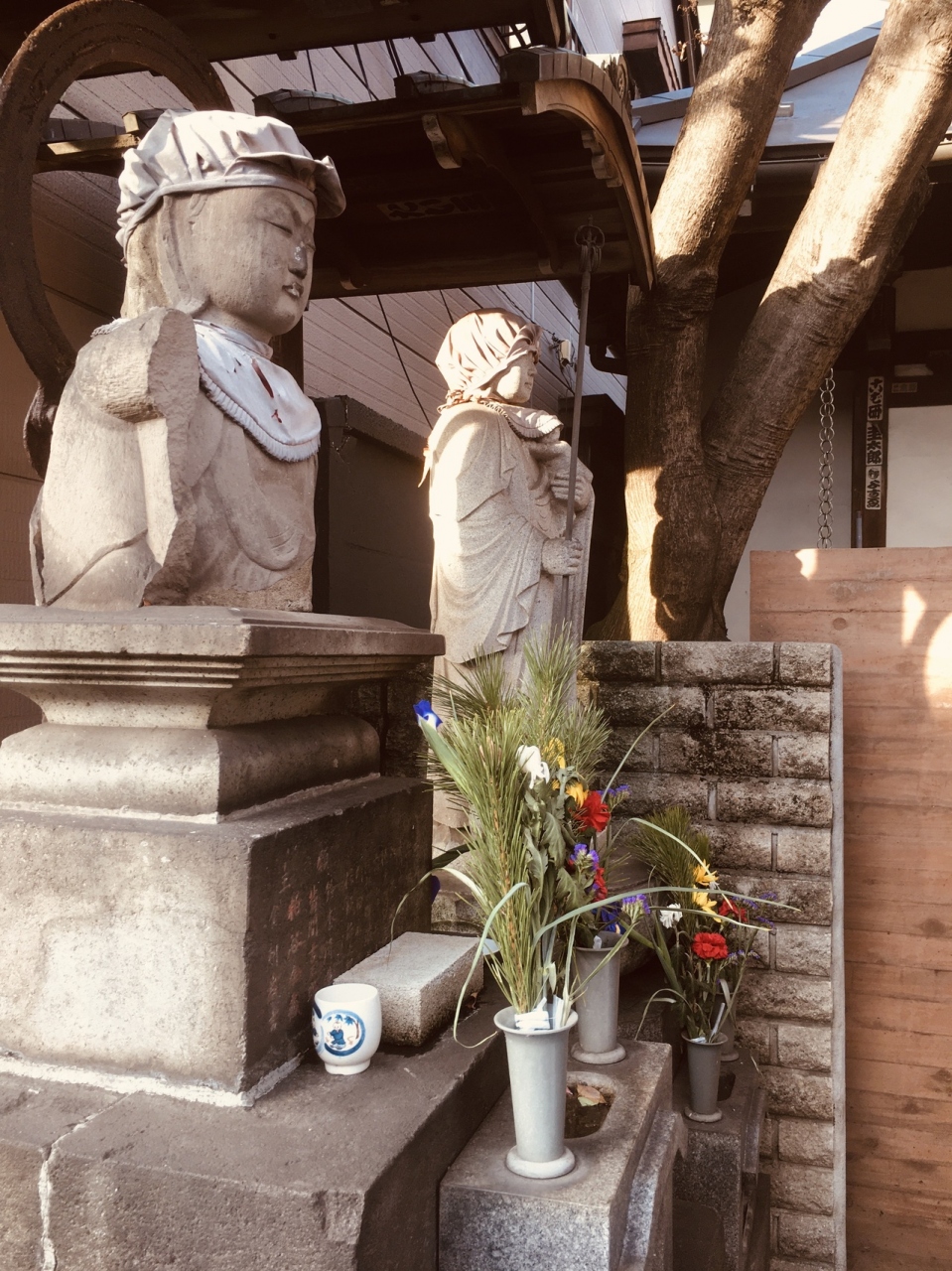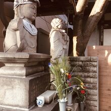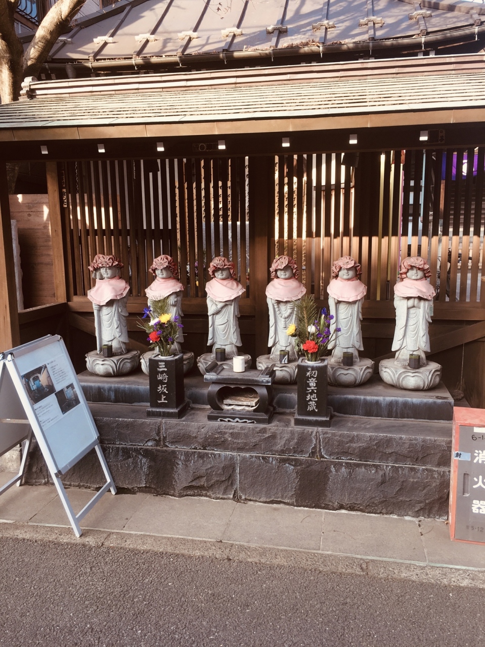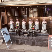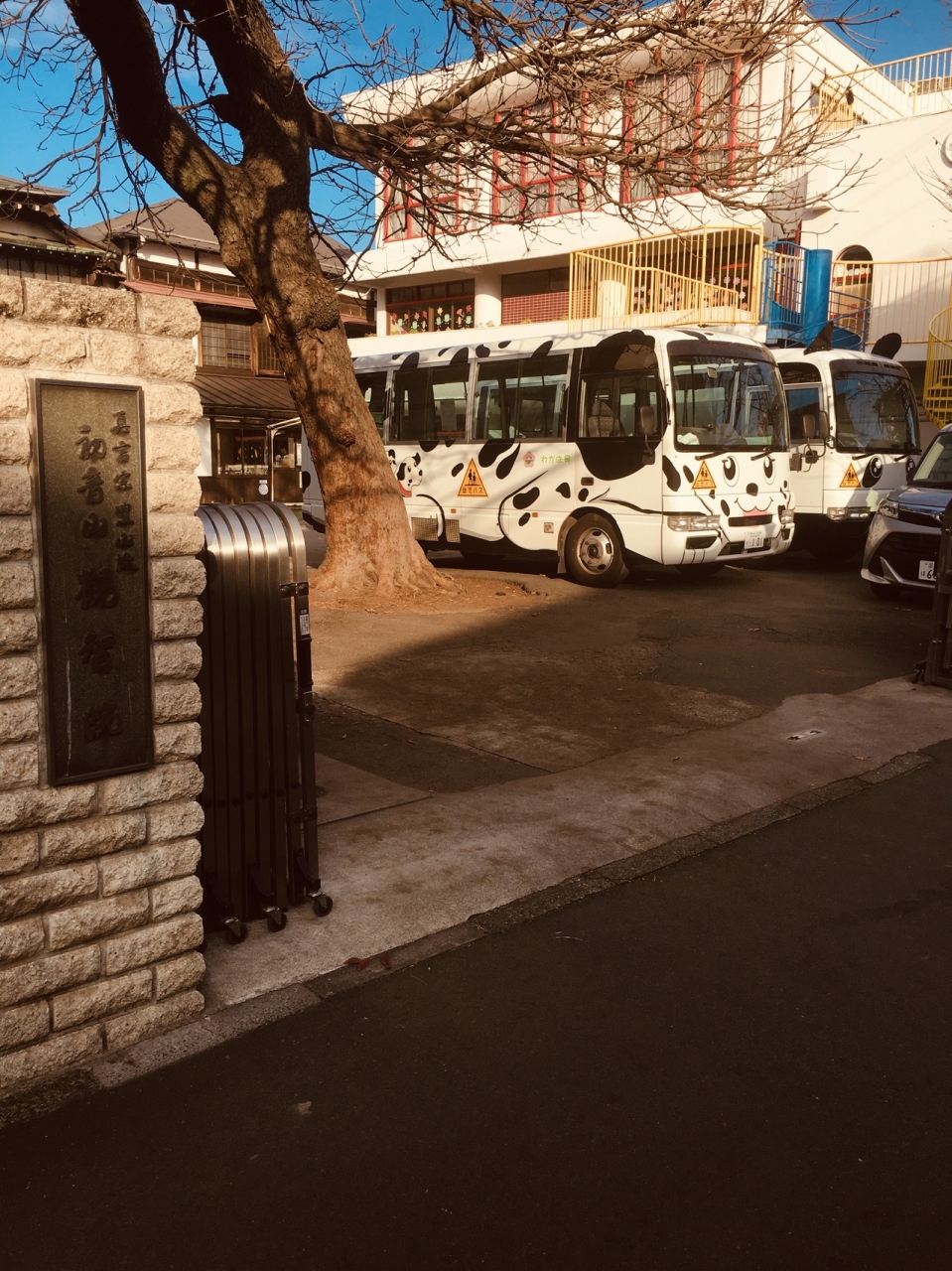 門横には6体のお地蔵様が並び、赤い前掛けをしていて、横にも2体のお地蔵様がありました。幼稚園も併設している寺で、幼稚園バスが何台が止まっていました。本堂には紫の垂れ幕のようなものが掛かり、本堂前は少しの空間があります。