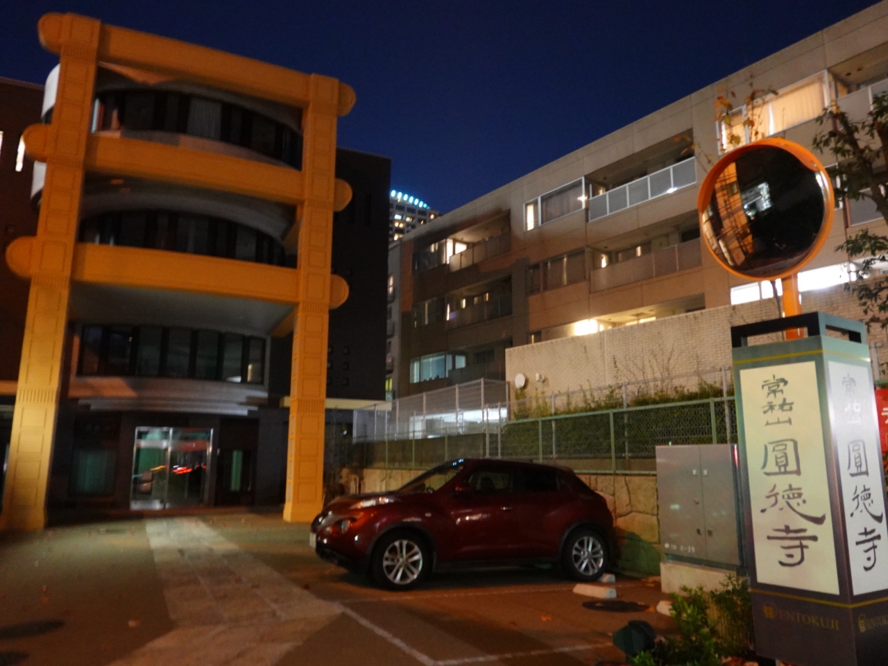 二の橋の交差点から日向坂を少し東に登った左手にあるお寺です。山門らしきものはなく、駐車場の奥に見えるのは、近代的なビルのような建物です。以前通りかかった時とは異なる建物のようで、近年造り直したようです。なかなか奇抜なお寺だと思いました。