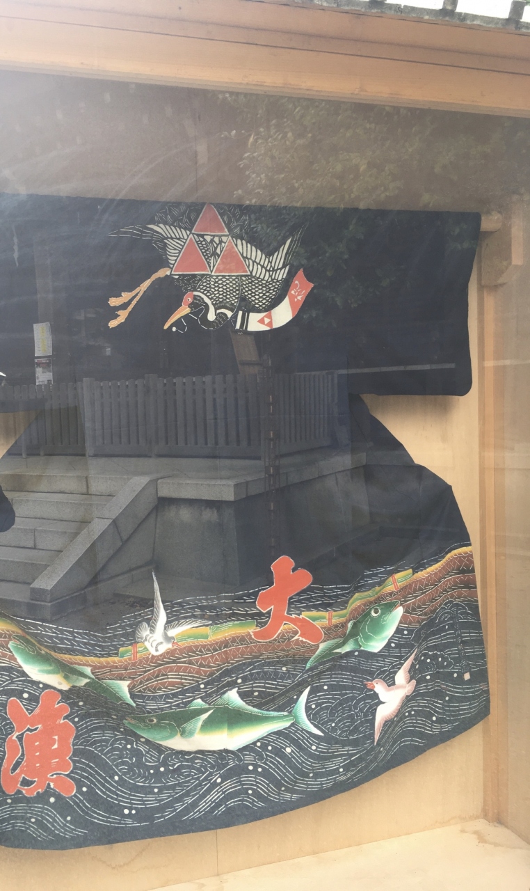 小田原駅から歩いて10分ほどにある神社で境内には地元団体が大漁を祝う漁師の晴れ着「万祝(まいわい)」が展示されていました。衣紋部分に縁起物の鶴と小田原北条氏の家紋である三(み)つ鱗(うろこ)を入れ、裾の部分には「大漁」の文字と、かつて小田原の浜に大量に揚がったブリをあしらっているそうです。