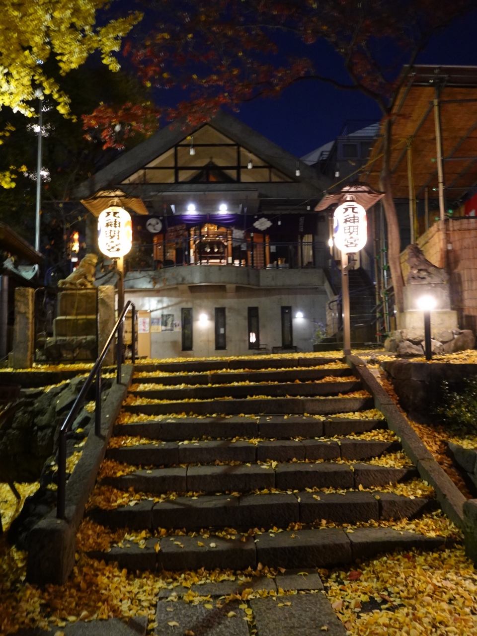 仙台坂下のレストランで夕食を終えた後、宿泊先の「プリンスパークタワー東京」に戻る途中に参拝しました。人通りが少なく灯かりも少なめの神明坂にあって、ひと際目立っていたのがこちらの神社です。訪れたのが12月の中旬で、本殿に続く石段に積もったイチョウの葉が、本格的な冬の訪れを感じさせました。