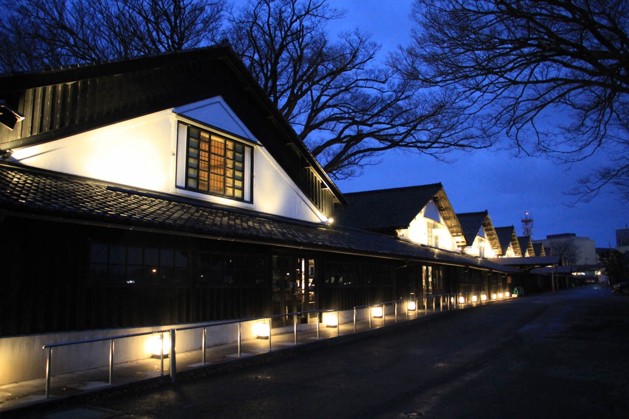 山居倉庫は、吉永小百合さんがCMに出演しているJR東日本大人の休日倶楽部のロケ地でもあります。日本海からの強い西風と夏の直射日光をさえぎり、倉庫内の温度を一定に保つ目的で植えられたケヤキ並木が、完全に落葉していたのがちょっと残念でしたが、黒板壁が続く倉庫群は壮観で見応えがあって良かったです。