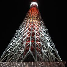 押上のホテルに宿泊し、様々な時間帯に様々な角度から東京スカイツリーを眺めました。特に印象的だったのは、十間橋から見るスカイツリーと逆さスカイツリーの光景、マジックアワーに見たスカイツリー、スカイツリータウンのすぐ間近から見上げた暗闇に浮かび上がる光景です。この日は通常ライティングの日で赤色にライトアップされていましたが、間近から見上げるその姿はとても迫力のあるものでした。