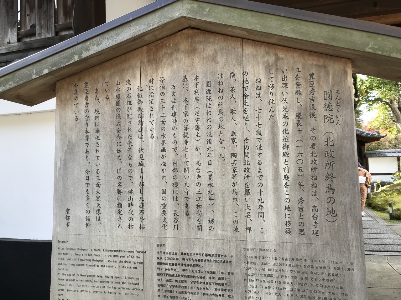圓徳院は、臨済宗建仁寺派の寺院で、「ねねの道」の西側にあり、高台寺の塔頭のひとつです。豊臣秀吉の正室・北政所(高台院)が晩年の19年間を過ごした場所として知られています。高台寺を観光した後に、こちらへ立ち寄りました。伏見城から移した庭園は、移築後に小堀遠州が整えたもので、巨石を多く配置してあってきれいに整備されていて美しかったです。