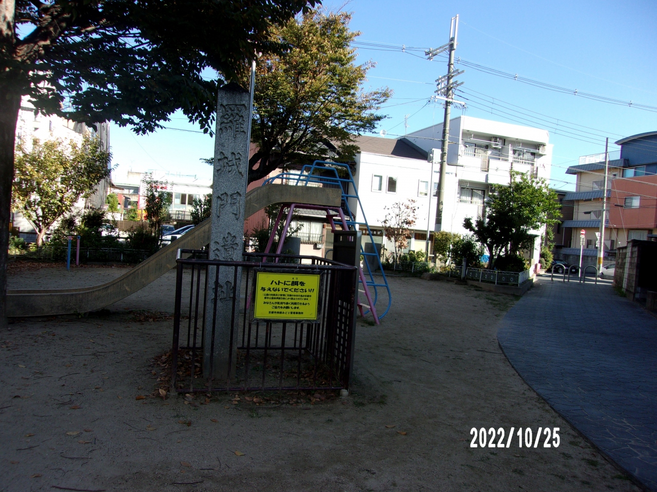 この羅城門跡九条通り沿いにあります。現在は石柱の碑と復元図が描かれた説明板があります。近鉄京都線東寺駅から西に10分強の場所にあります。この平城京の羅城門は大内裏から南に延びる朱雀大路の南端にありました。この門の両側には城壁が伸びるのですがその痕跡はありません。当時は門のみだったようです。