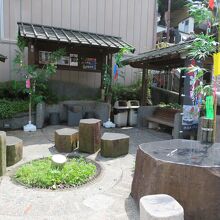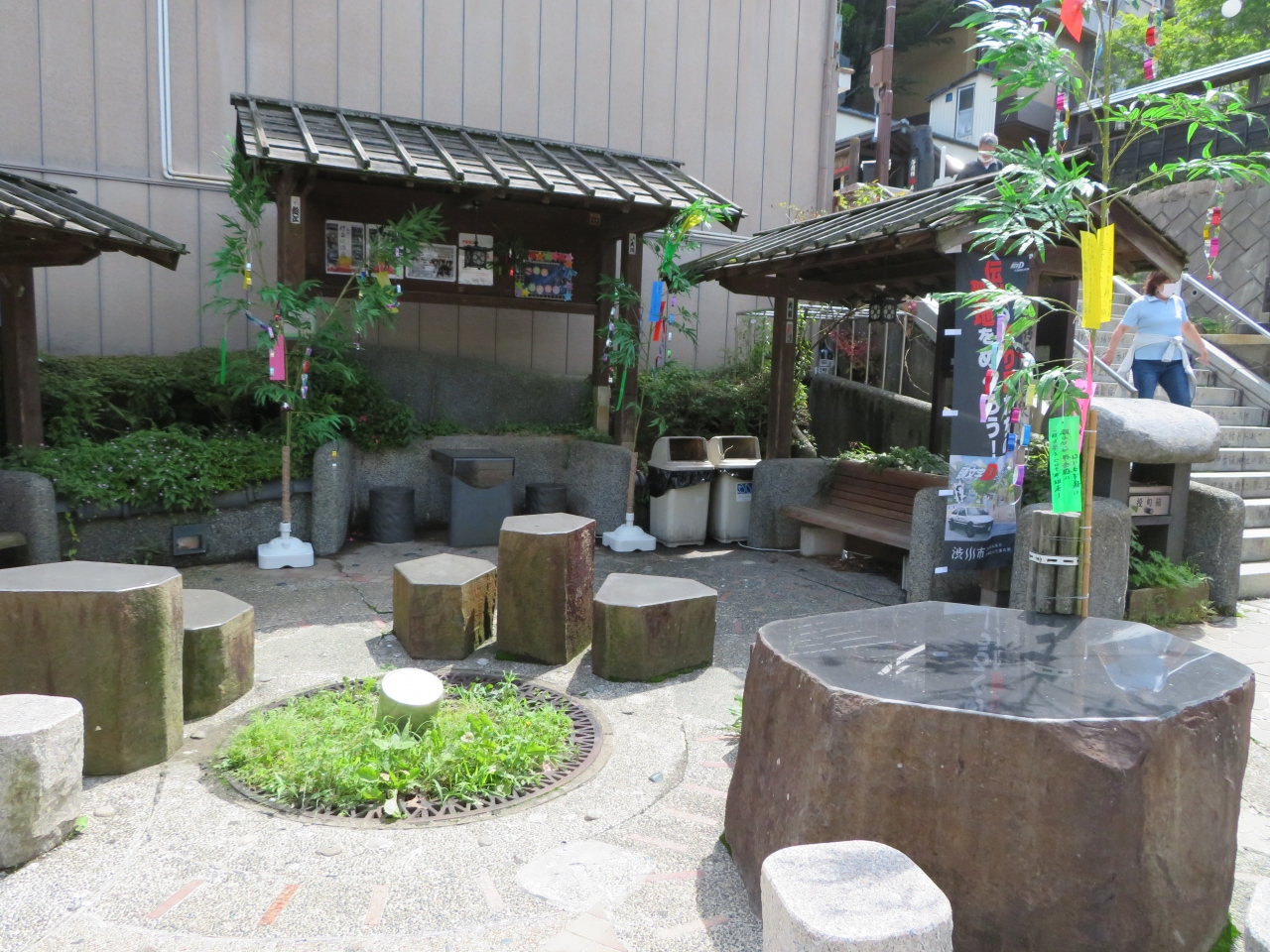 石段街のほぼ真ん中にある休憩スポットです。広場内には水飲み場、ゴミ箱、石のテーブルと椅子、与謝野晶子の歌碑がありました。地面に貝殻が埋め込まれていたのですが、こちらの貝殻は姉妹都市である逗子市の海岸のものだそうです。