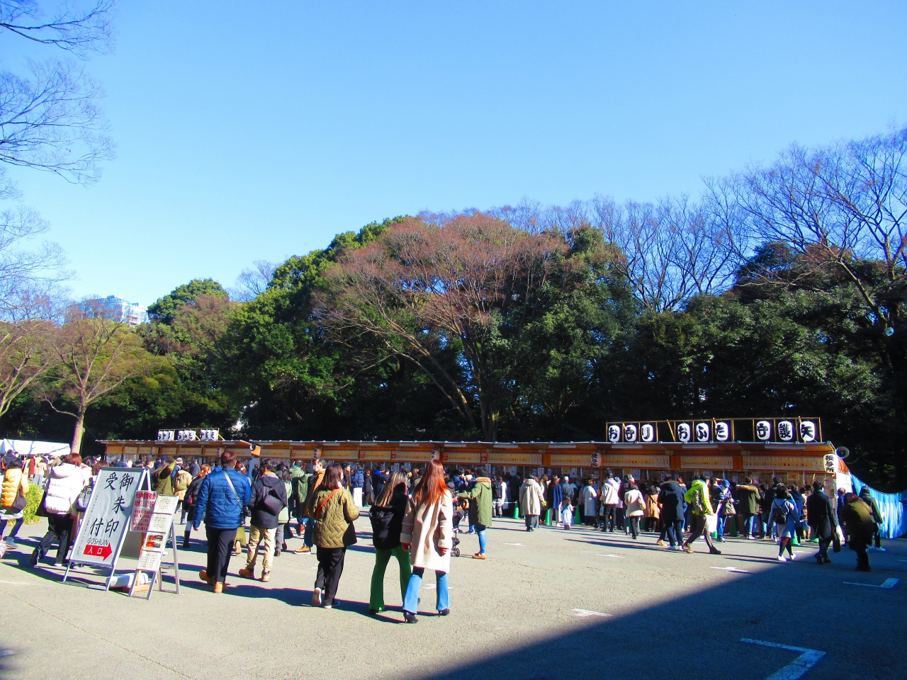 初詣の人出全国1位なので、1月8日でもまだ混んでいるかな?と思いながら行きましたが、山手線外回りが運休していて品川方面か行きにくくなっていたせいか、松の内が過ぎたせいか混んでなくて、スムーズに参拝できました。一方通行の順路になっていていて、授与品の販売も広いスペースの仮設店舗(?)でやっていて、混雑対策が徹底されていました。