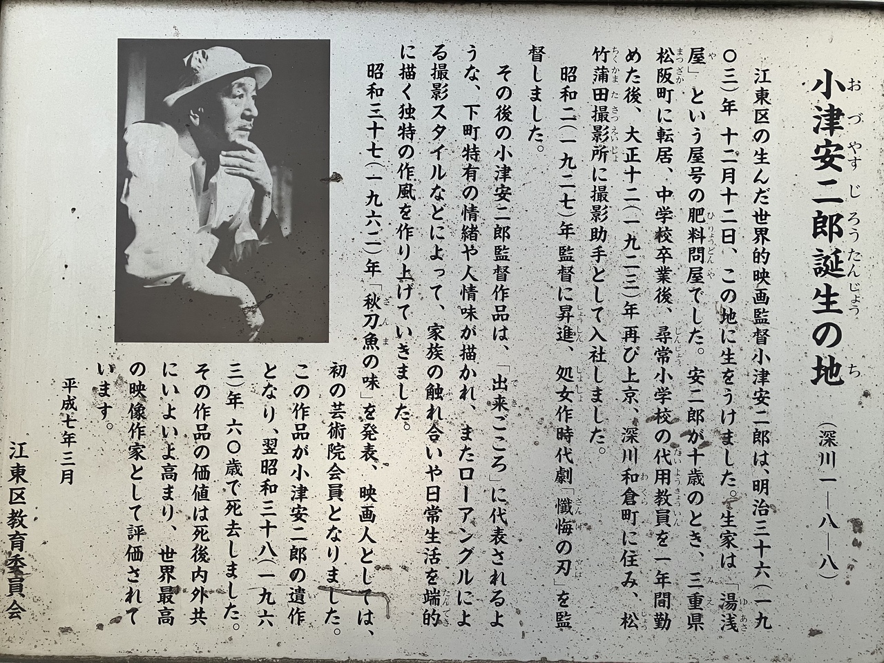 清澄白川駅から門前仲町駅へ向かって、清澄通りを歩いていた時に道の端っこに「小津安二郎誕生の地」と書かれた案内板を見つけました。深川えんま堂などの近くです。特に家屋があるわけではなく、道に突如案内板があったので驚きました。