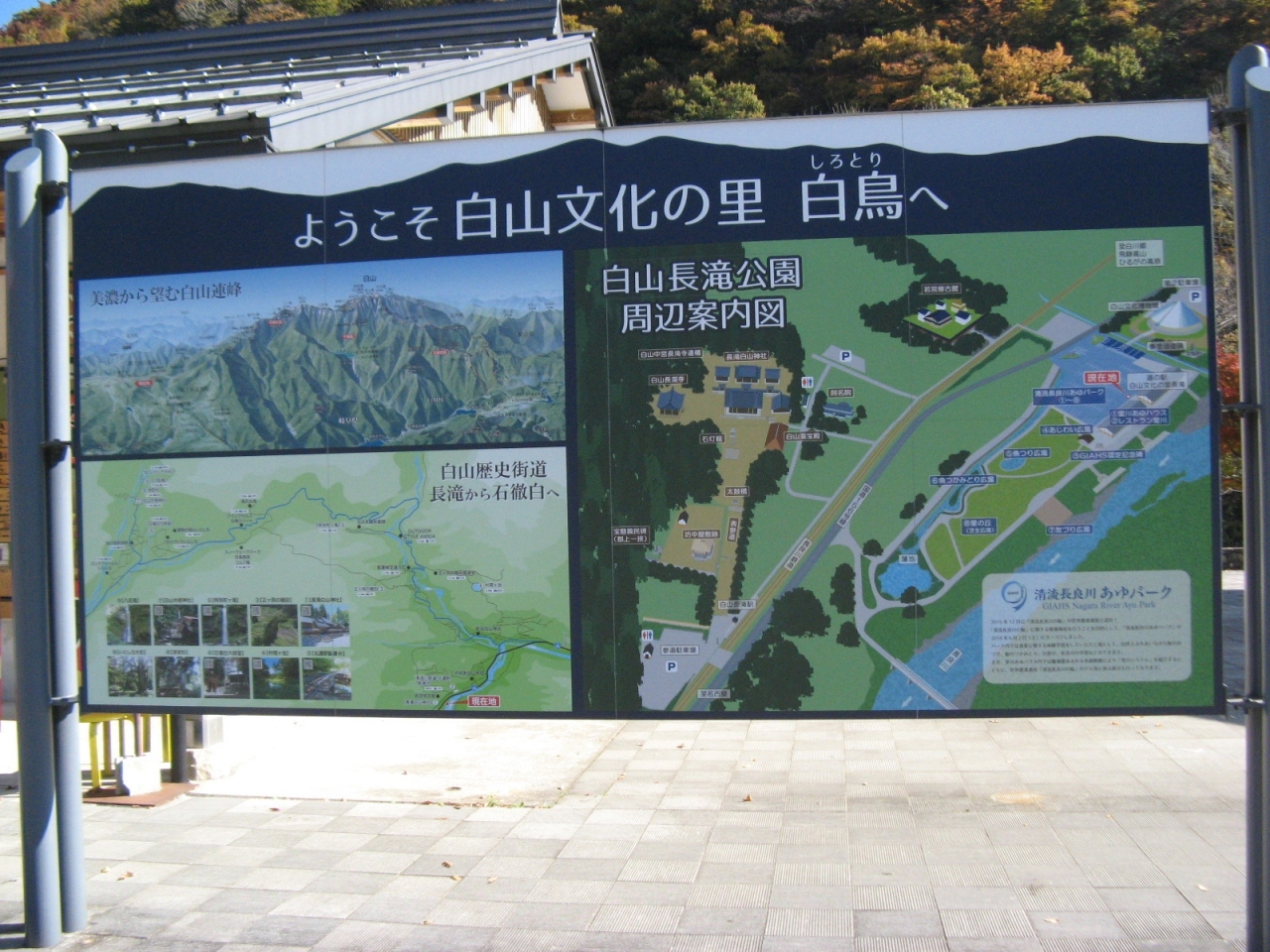 「清流長良川あゆパーク」が併設され駐車場も広い大きな道の駅です。レストラン、お土産、野菜売場、情報コーナーなど一通り揃っていて統一感があります。駅の裏手はすぐ長良川で季節には鮎が獲れる漁業体験がでる様ですが訪れたのが11月で残念ながら体験は出来ませんでした。同じ敷地内に白山文化博物館、国道158号線を挟んで長滝白山神社や長滝寺もあり周囲の自然も豊かでのんびりできる道の駅です。