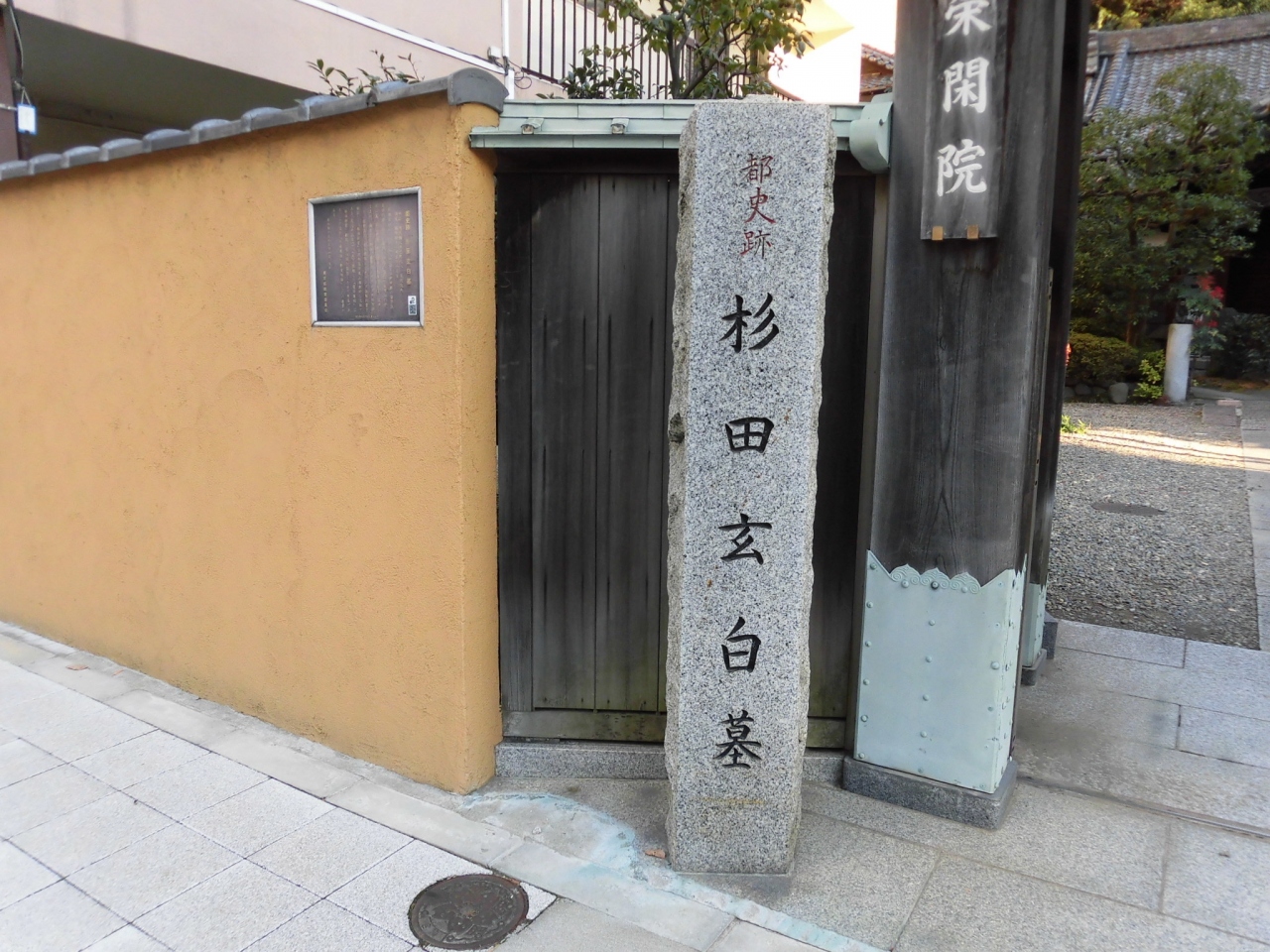 虎ノ門近辺を散策していて立ち寄った、栄閑院という浄土宗のお寺に、江戸時代の医学者、杉田玄白のお墓がありました。解体新書で有名な方のお墓が、このような場所だったとは、思いもかけなかったお寺で驚きました。お参りに行くときには、門前に石柱が立てられているので、比較的見つけやすいと思いました。