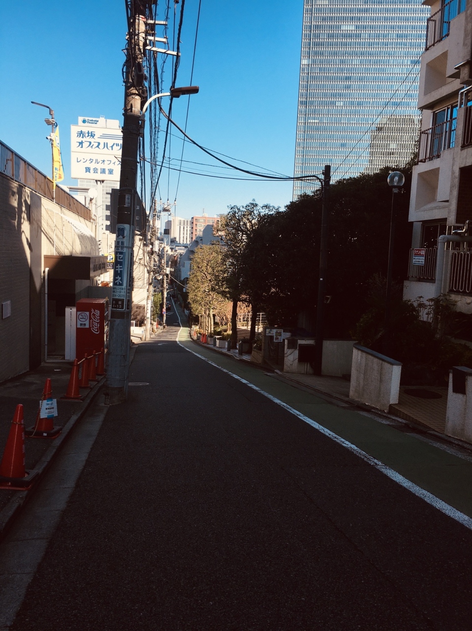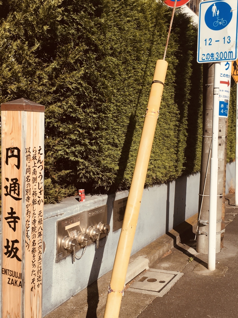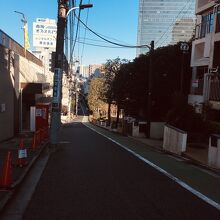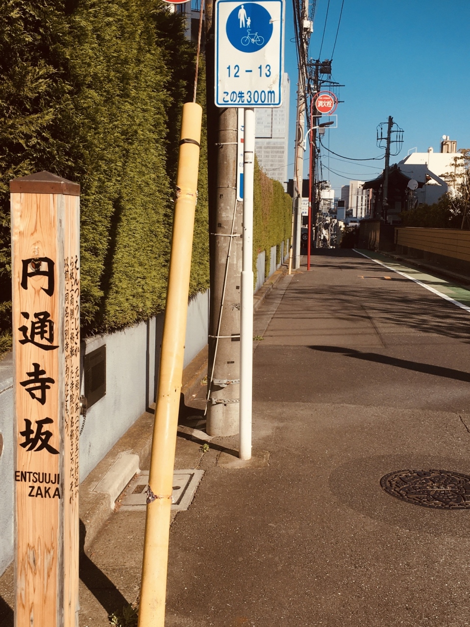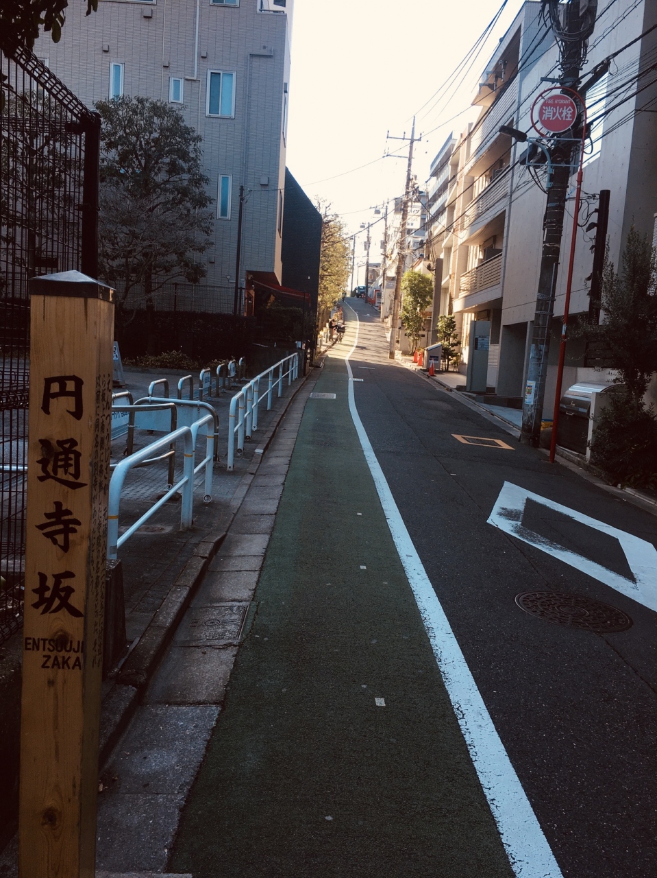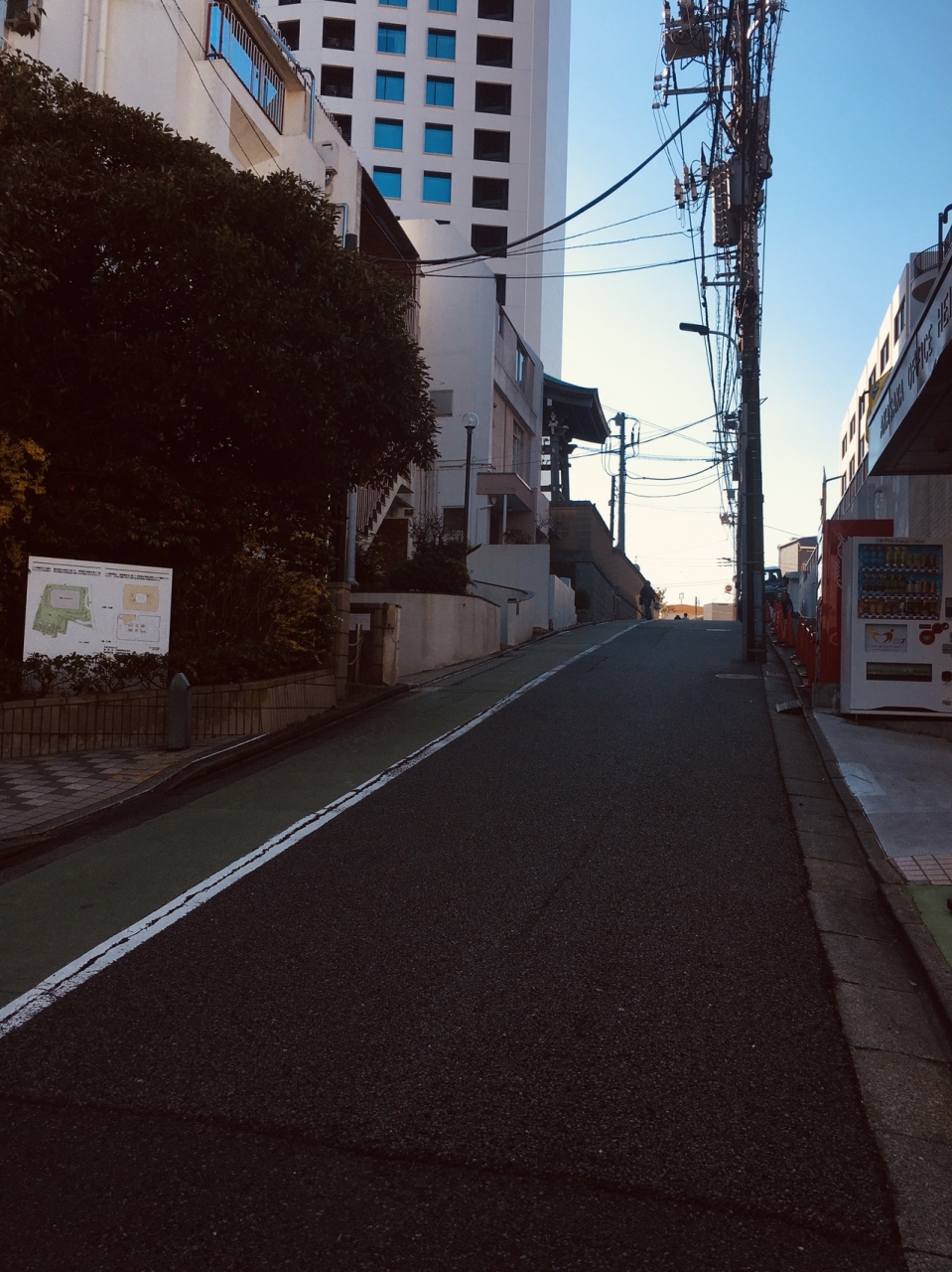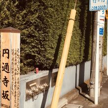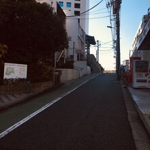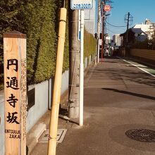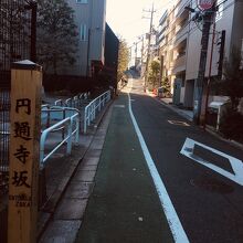 坂沿いに坂の名前と同じ寺と公園があり上から降ると両方とも右側にあります。寺の鐘がある付近から傾斜となり、坂道沿いの左右には建物が連なっていて、公園付近から平らな道になります。道幅は狭く自動車1台ぐらい通れる幅でした。