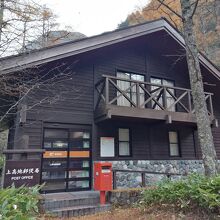 バス待ちの時間に立ち寄ってみました。外観は周りの自然に溶け込む山小屋風。入口のポストがなければ気づかない人もいるかもしれません。用はなかったのですが、冷やかしで中へ…。自由に押せる12種類もの上高地記念スタンプがあり、テレビのロケで来た誰のものか分からないサインが2つ飾られていました。