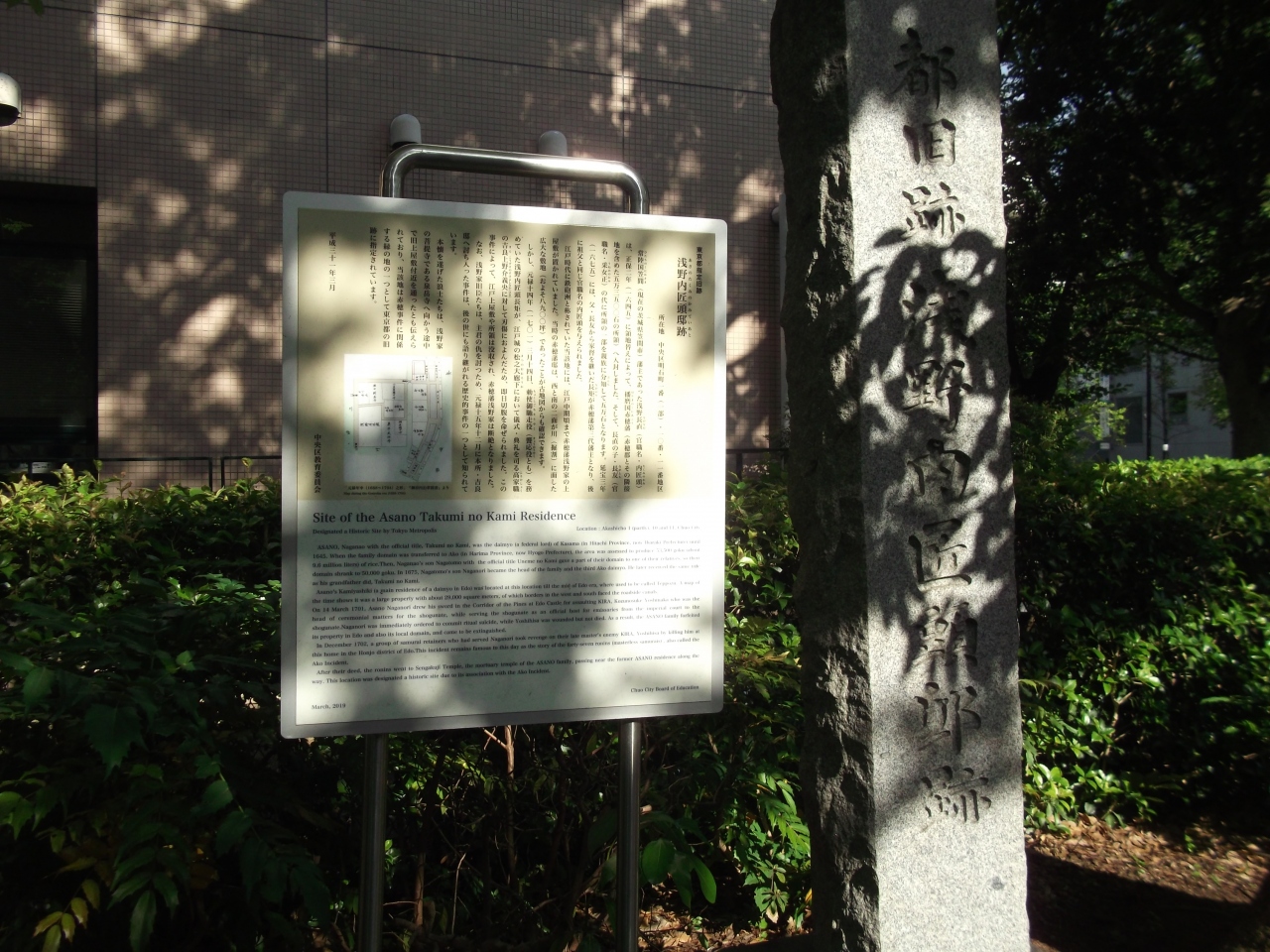 聖路加国際大学の築地川公園に面した一角に、この石碑と説明板が立っていました。この付近は元禄年間には赤穂藩浅野家の広大な上屋敷がありましたが、吉良上野介への刃傷事件で没収されてしまいました。今は当時の面影を残すものは何もありませんが、石碑が歴史の1ページを教えてくれました。