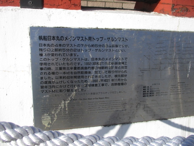 日本丸メモリアルパーク内に日本丸のメインマスト用トップゲルンマストが入口運河沿いに展示されていました。トップゲルンマストは長さ約18m、直径約50cmで横置きに展示されています。下部は銅製で上部はヒノキが使用されてました。実際に間近に見れてスケール大きさを感じられました。訓練センターの前にありました。