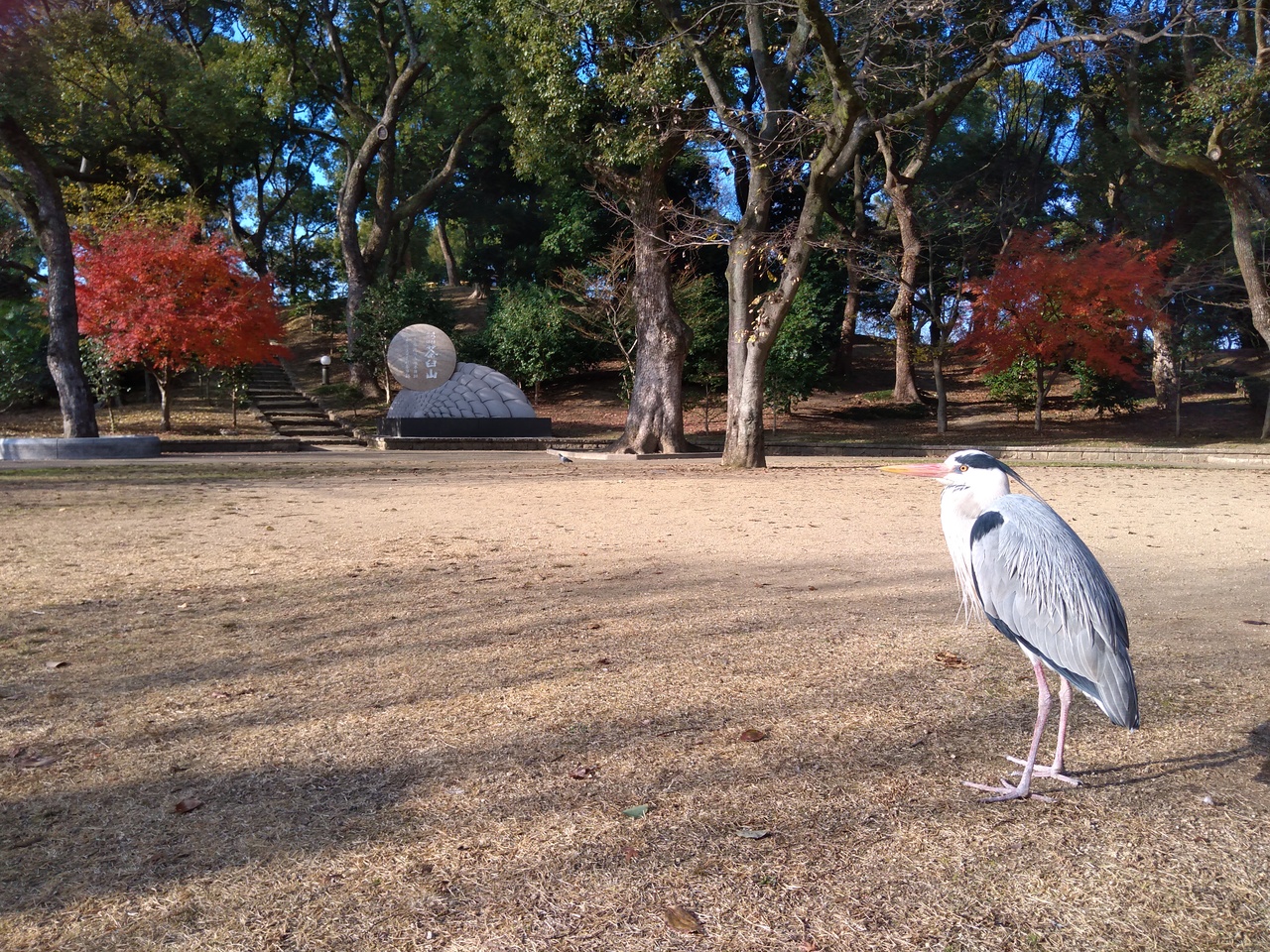 天王寺公園の北側にある河底池や茶臼山付近には、大阪市内ではほぼ目にすることのない野生のサギが飛来してきます。ここに住み着いているかは不明ですが、体長は1m近くあってそこそこ大きく、人に慣れているのかある程度近寄っても逃げません。