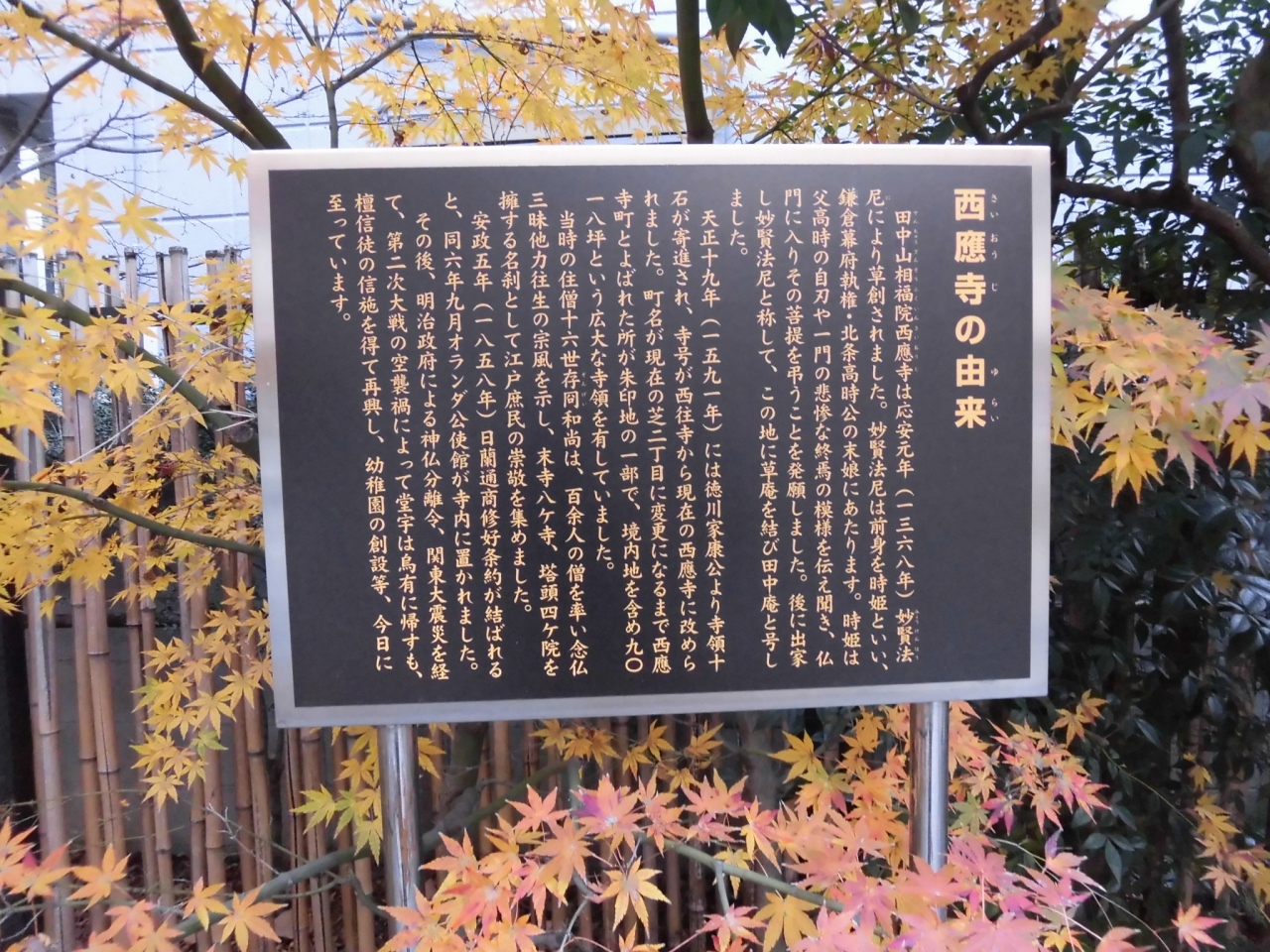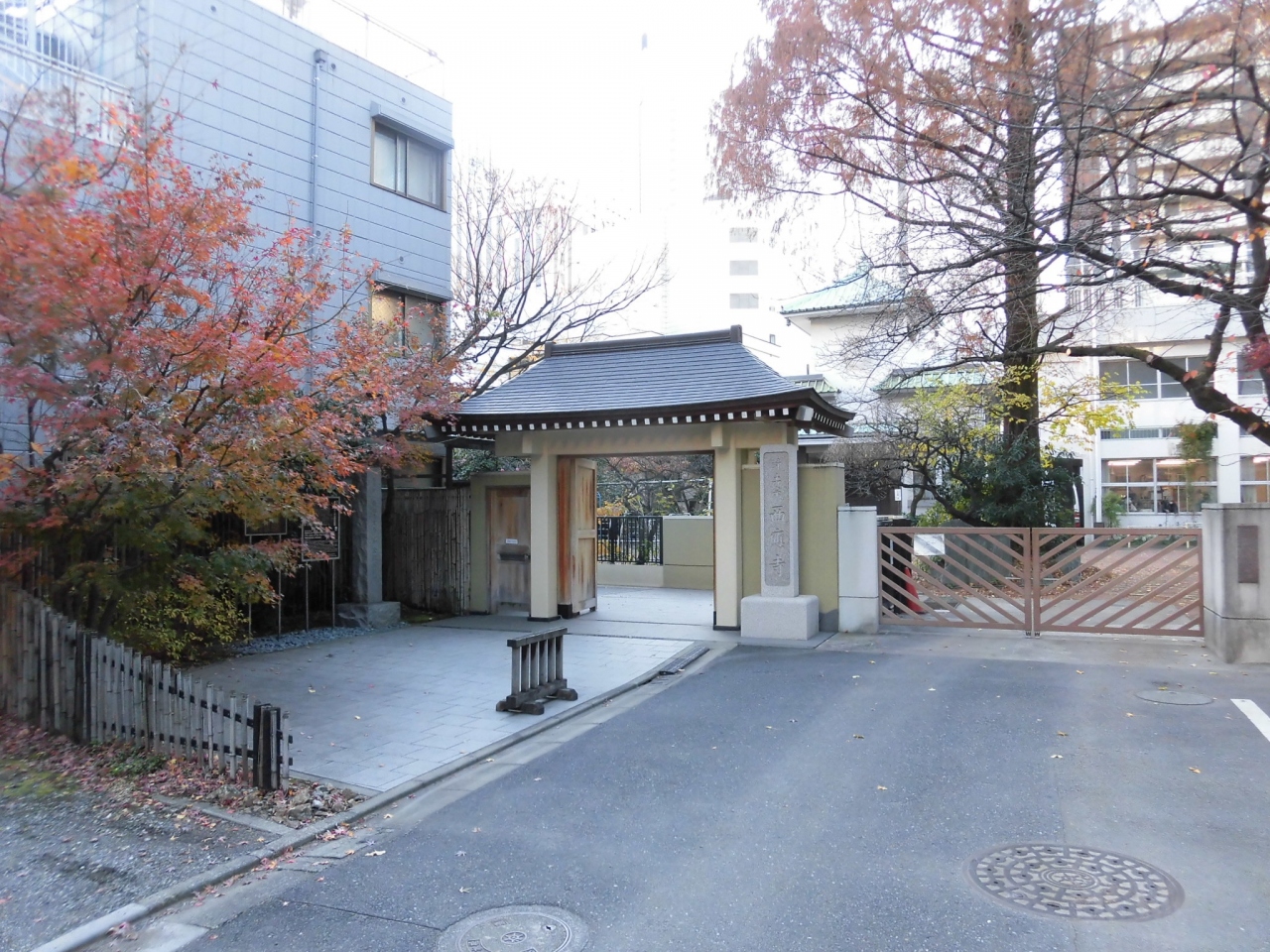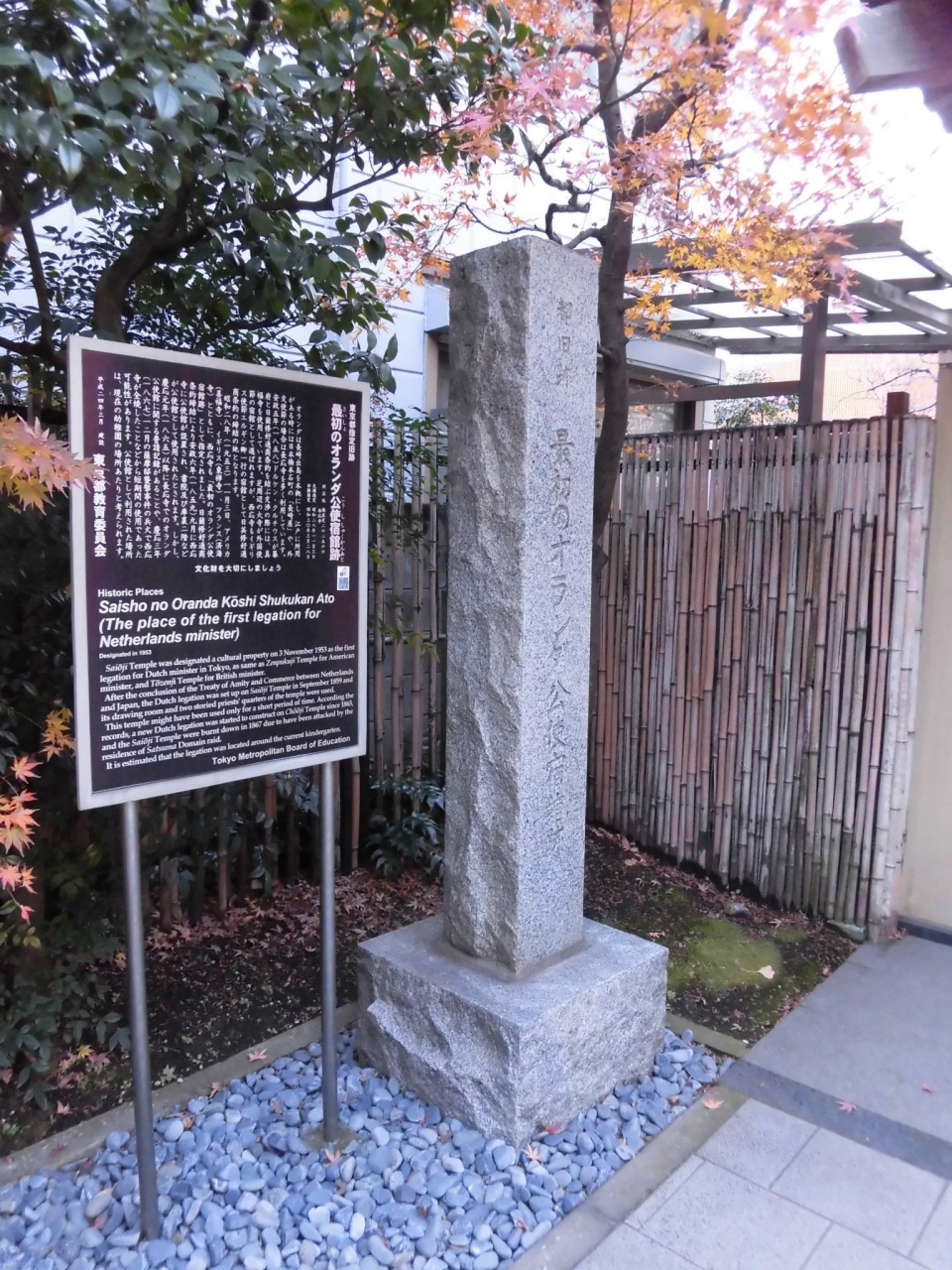 門前に案内板と石柱が立てられていて、この寺院が江戸時代のオランダ公使が最初に利用した宿舎だと記されていました。確かに今と違ってホテルなどあるわけもなく、おそらく警備などが容易な寺院などが選ばれたのだろうと思いました。またこの場所から江戸城までは結構距離もあるので、きっと馬などを利用して出かけたのかもしれないと思いました。