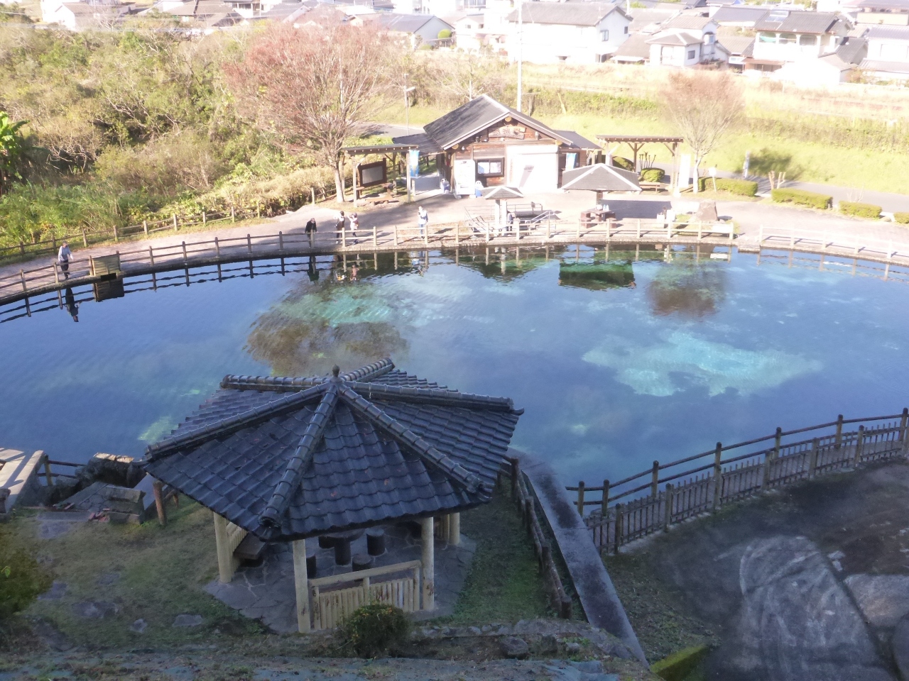JR栗野駅の裏側に隣接して丸池湧水があります。日本名水百選になっている丸池からは澄んだ水が大量に湧き出しています。 丸池の周辺一帯が公園になっているようで、散策できるように遊歩道や水汲み場などが整備されています。小高い山からは町全体を見渡せるようにもなっていました。