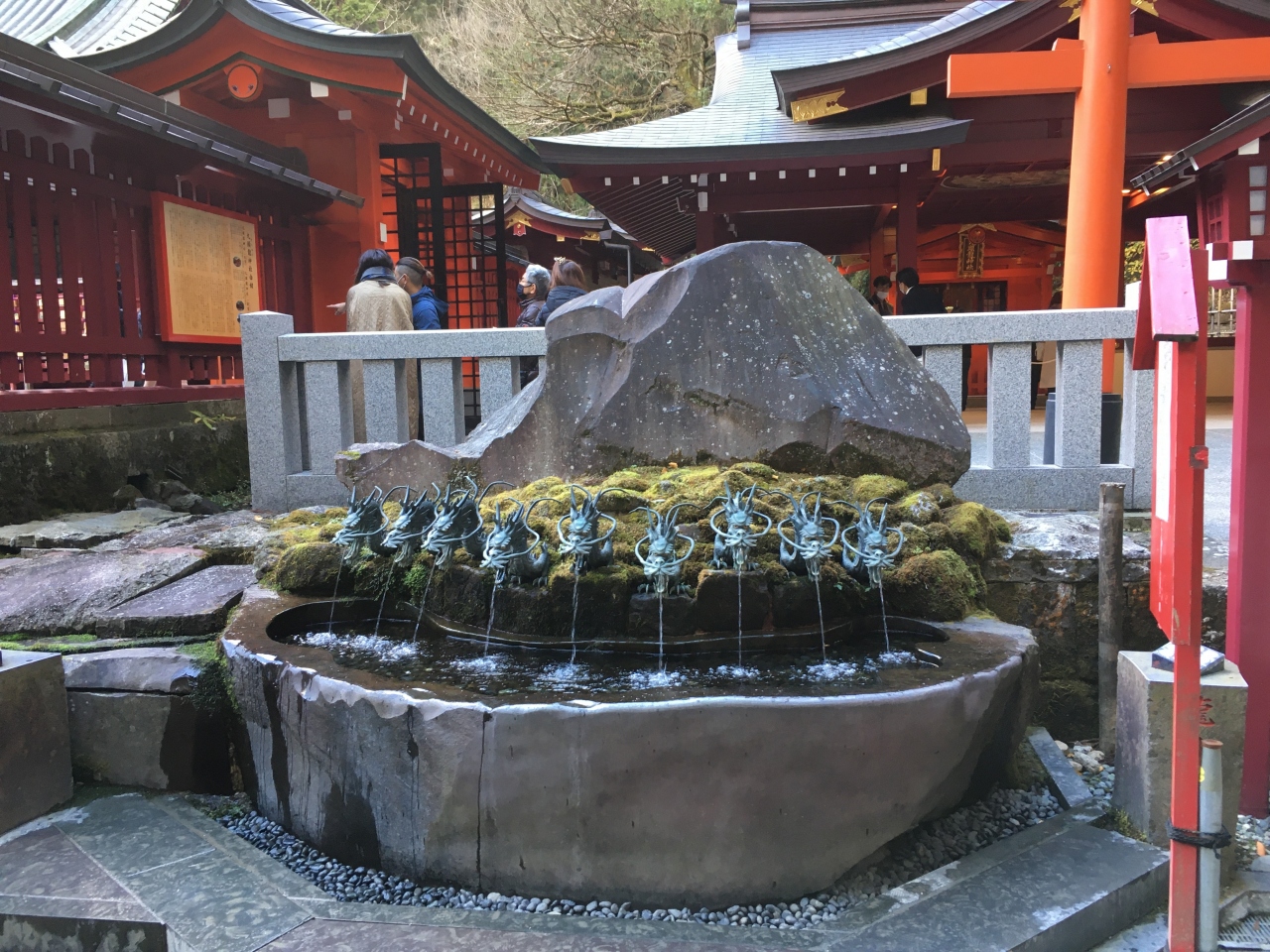 九頭龍大神を祀る九頭龍神社徒歩で行く(要入園料)こともできますが、本日は箱根神社よこにある九頭龍神社(新宮)を参詣。九頭龍の手水が印象的です。