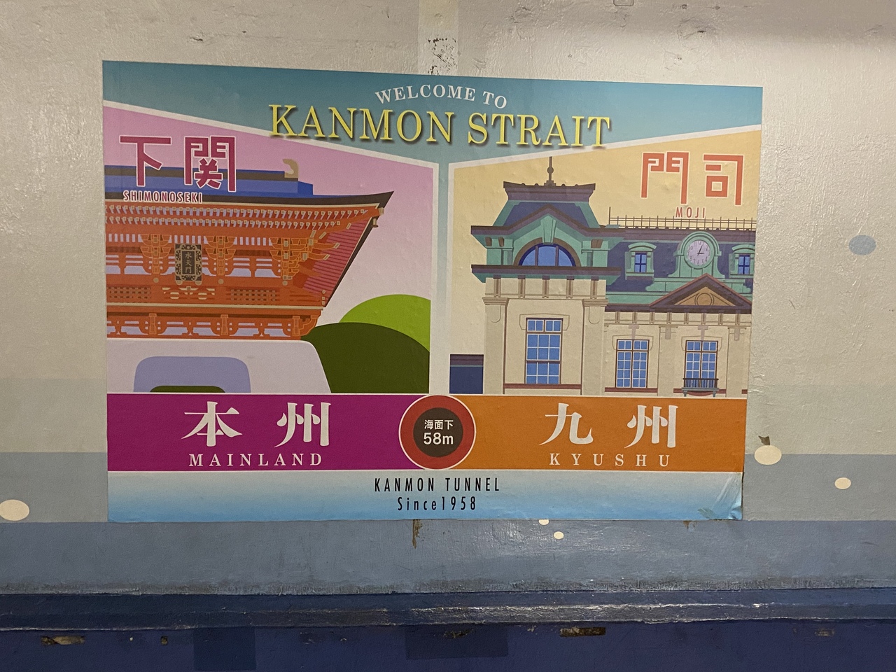 唐戸側から歩いて、門司港側まで歩いていきました。100メートル間隔くらいで、出口までの距離を示した案内板がありました。トンネルの真ん中あたりに、本州と九州の境目があり、記念写真を撮っている方がいました。門司港側までは歩いて20分弱でした。