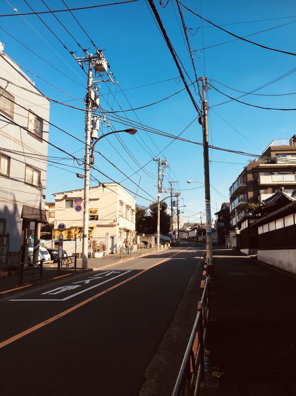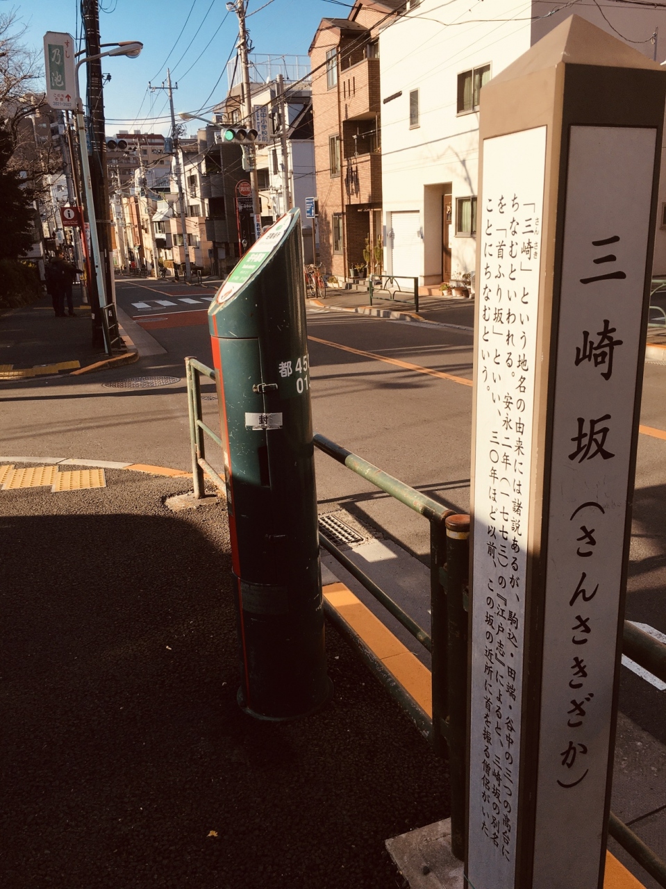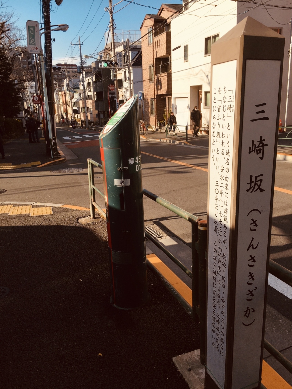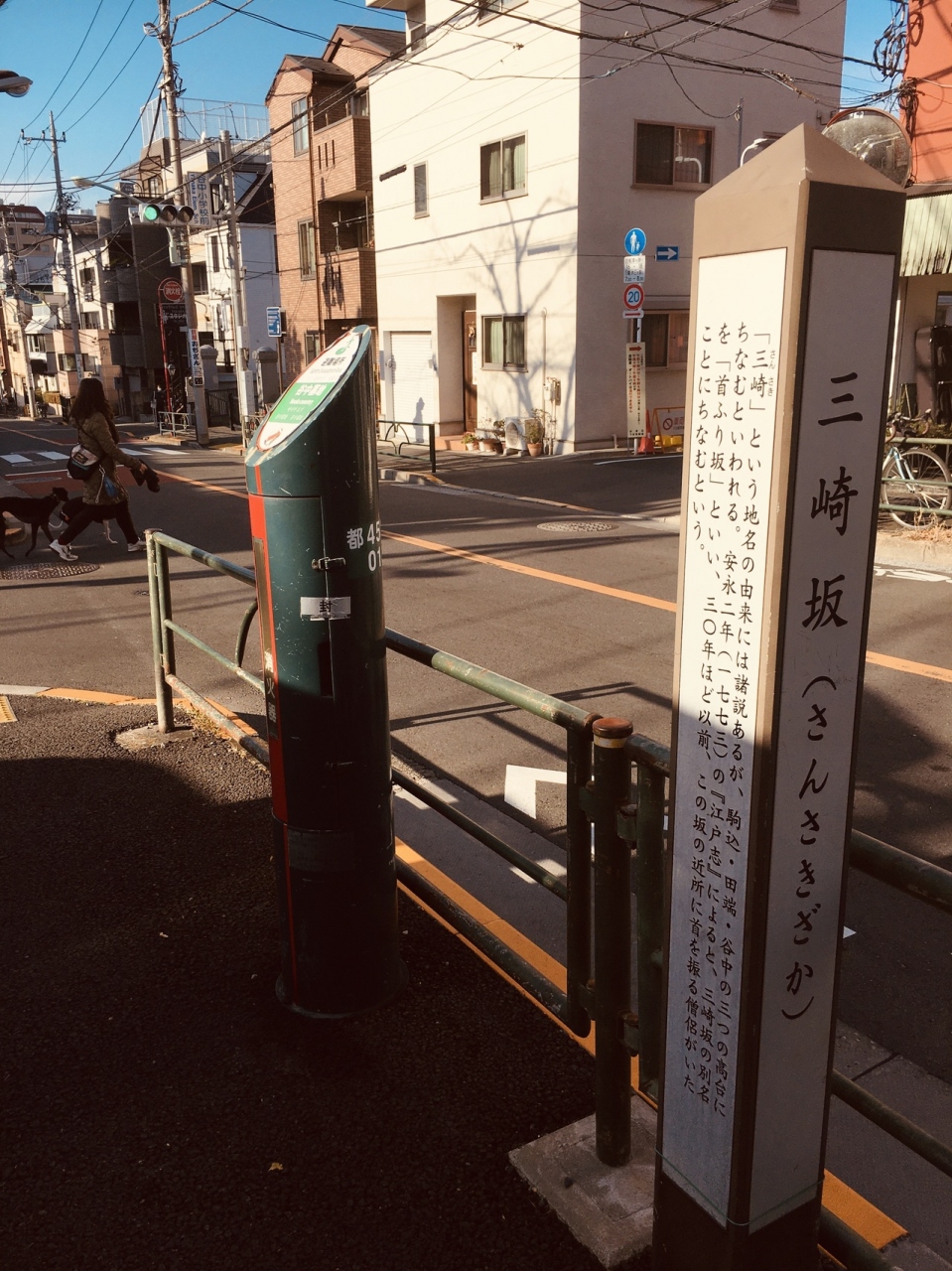 駒込、田端、谷中の3つの高台にちなむと言われる名称で、よく見かける坂道の光景で、交通量は多めで、左右には歩道がありますが幅が狭かったです。沿道にはいくつかお寺がありました。電信柱がやたら多く感じた坂道でした。