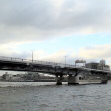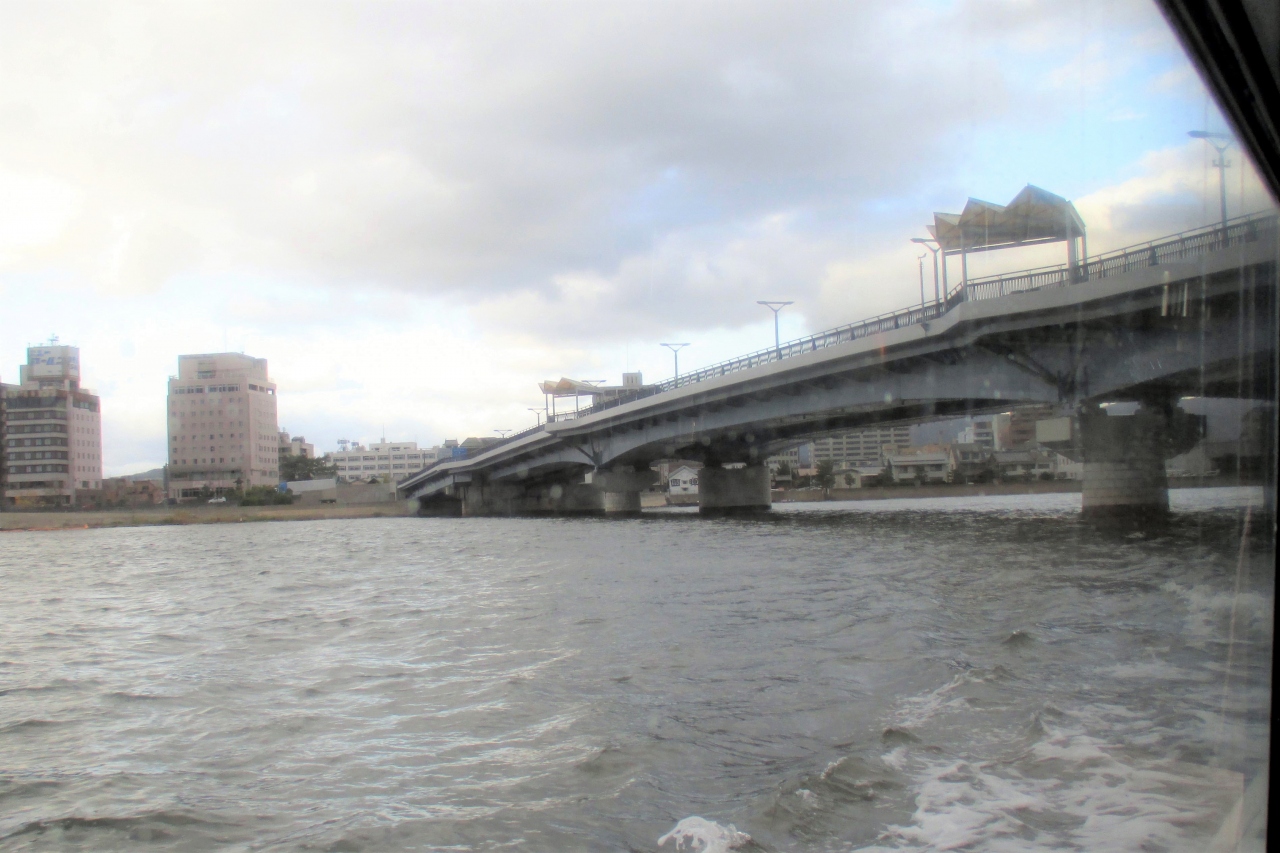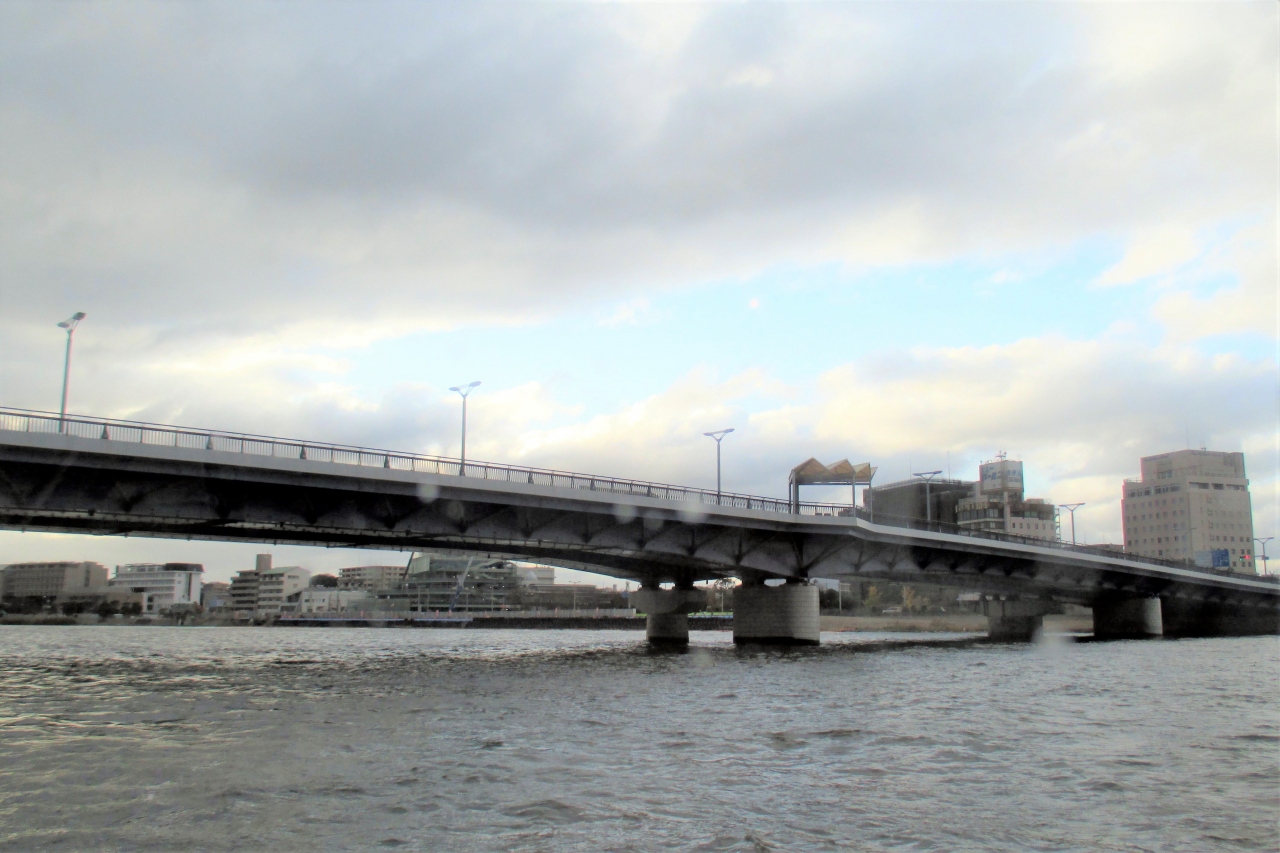 宍道湖大橋は、松江の市街地を流れる大橋川に架かる4つの橋の中で1番西(宍道湖側)に架かっていますが、この橋の変わっているところは、上流側が1971年(昭和46年)の架橋で、下流側は2002年(平成14年)の架橋と2回行なわれていることです。橋の上を走っている分にはその差はありませんが、橋脚を見るとまったく違っていました。橋の長さは309.9mです。なお、この橋を最初に架けた時から10年間は有料だったそうです。