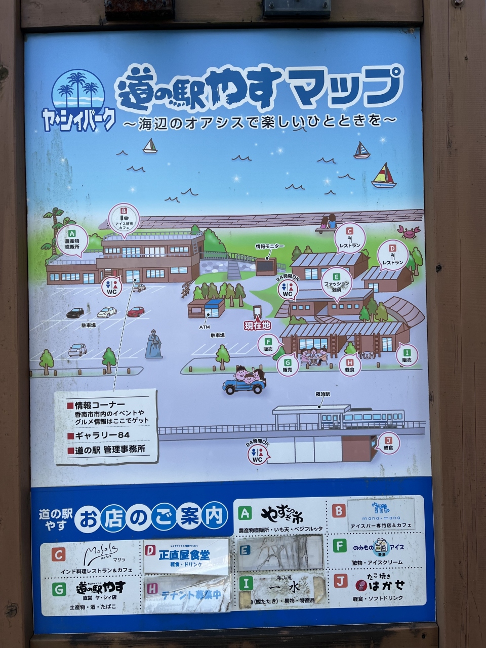 海沿いにある道の駅です。鉄道の夜須駅が道の駅のすぐ前にあり、車だけでなく鉄道でもアクセスしやすいです。物産館は2店舗あり、品揃えが良かったです。主に農産物を販売する店舗と高知の土産物を販売するお店に分かれています。「ヤ・シィパーク」という広い公園も隣接しています。