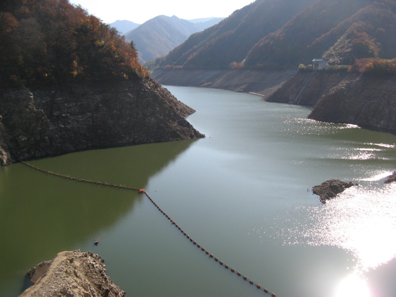 庄川水系境川に設けられた「境川ダム」によって造られた人造湖です。湖の西側は湖に沿うように村道が通っていて展望広場や森林公園が整備されています。11月に訪れたのですが湖と周辺の山々の紅葉風景と重なってとても綺麗でした。