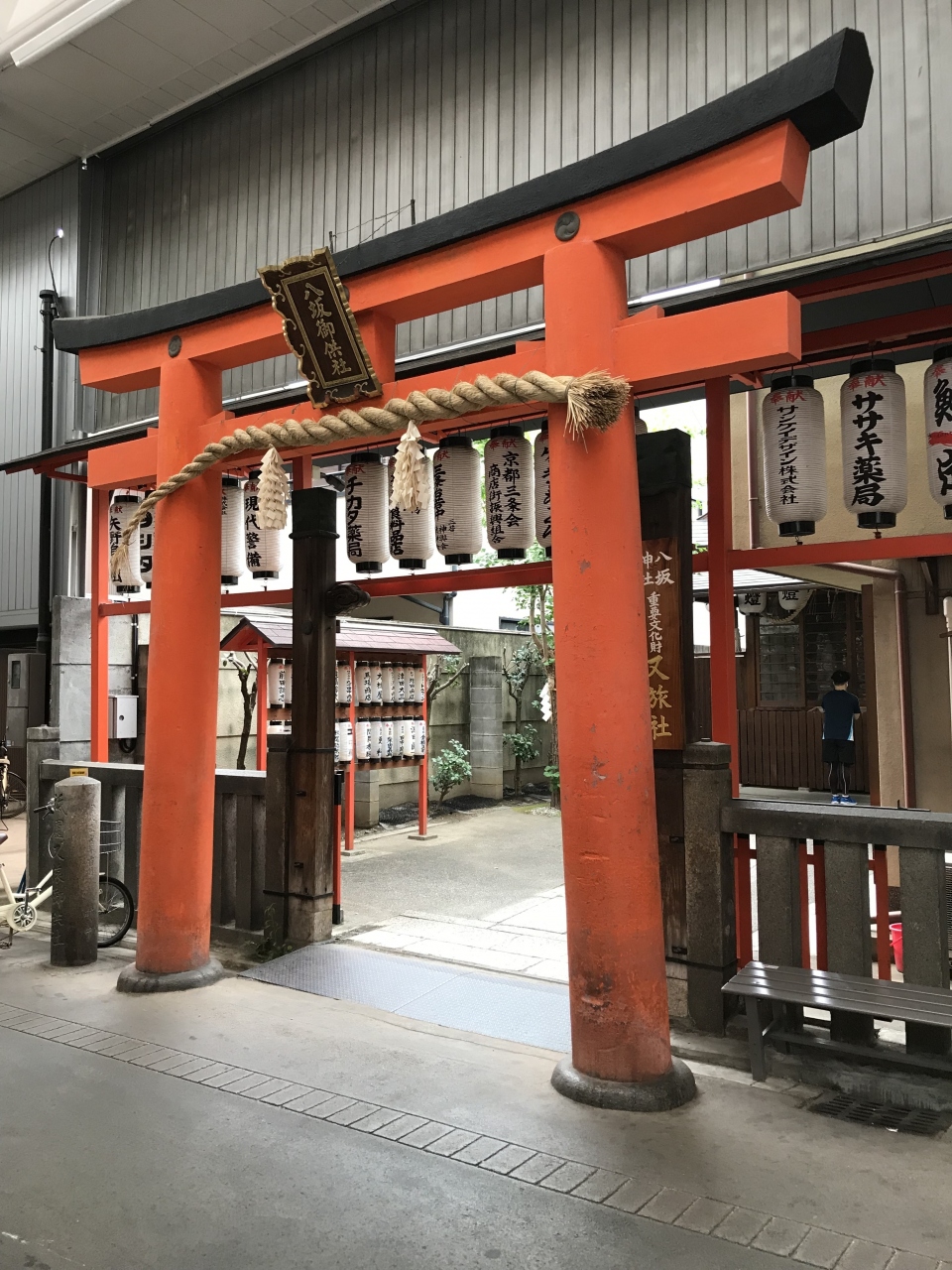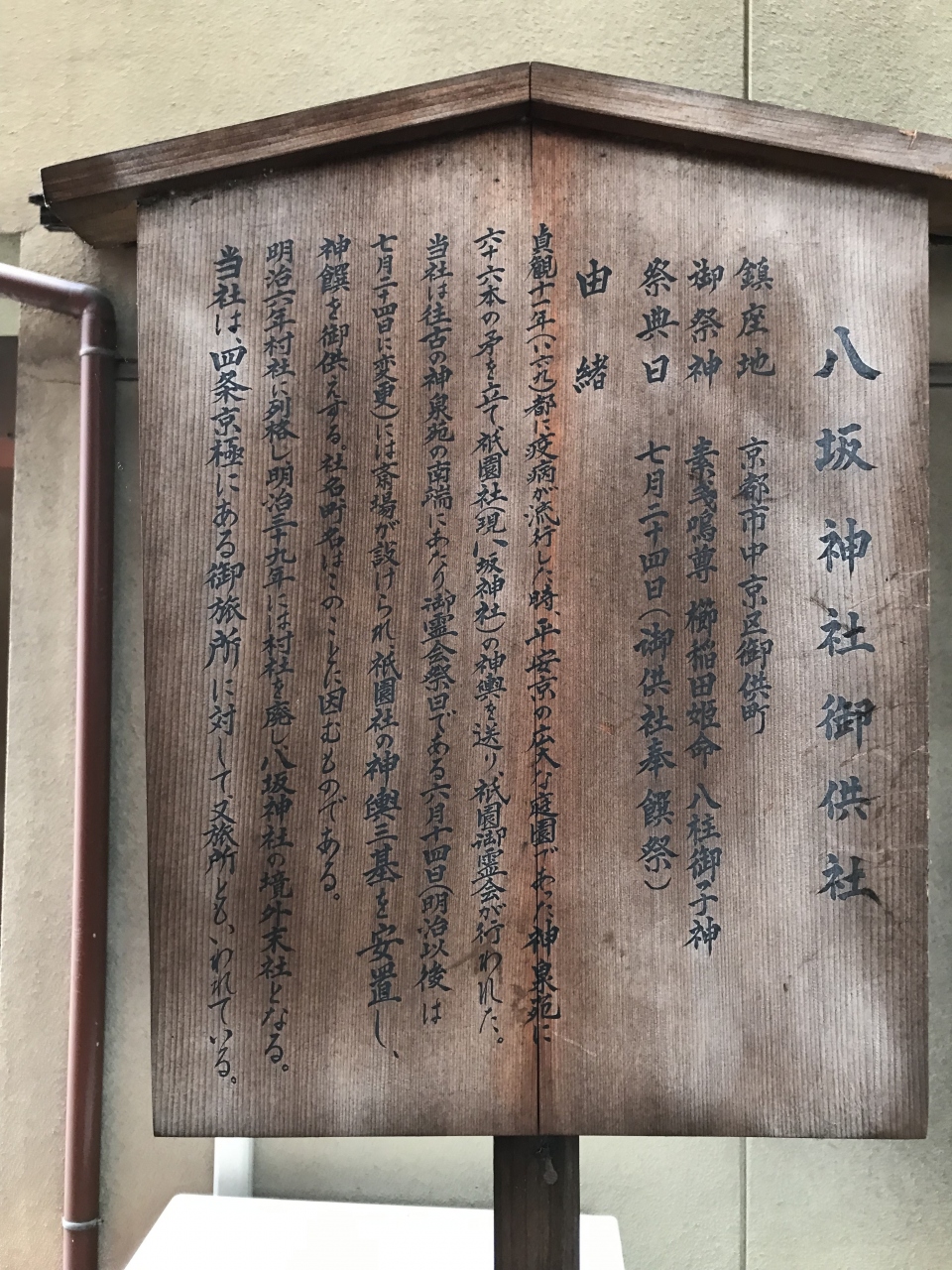 八坂神社御供社は、京都三条会商店街の中にあります。八坂神社の場外末社で「ごくうしゃ」と読みます。又旅社とも呼ばれています。八坂神社の境外摂社の一つで、祇園祭の際には、神輿が立ち寄る「御旅所」でもあります。祇園御霊会が行われた神泉苑の東南端に当たり、祇園祭の発祥地とされています。通り行く地元の人が一礼をしたりしていて、地元に根付いていることがわかる神社でした。