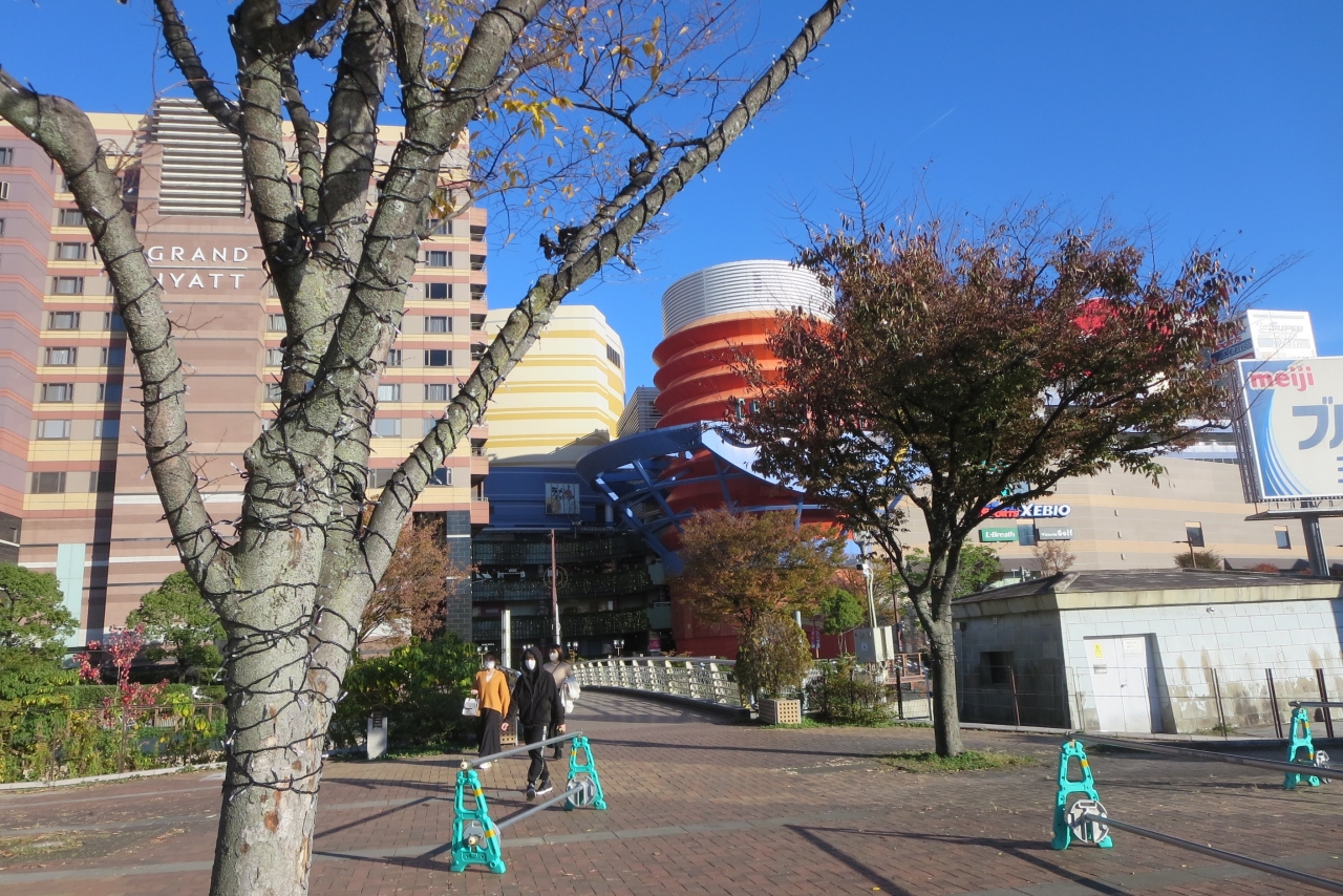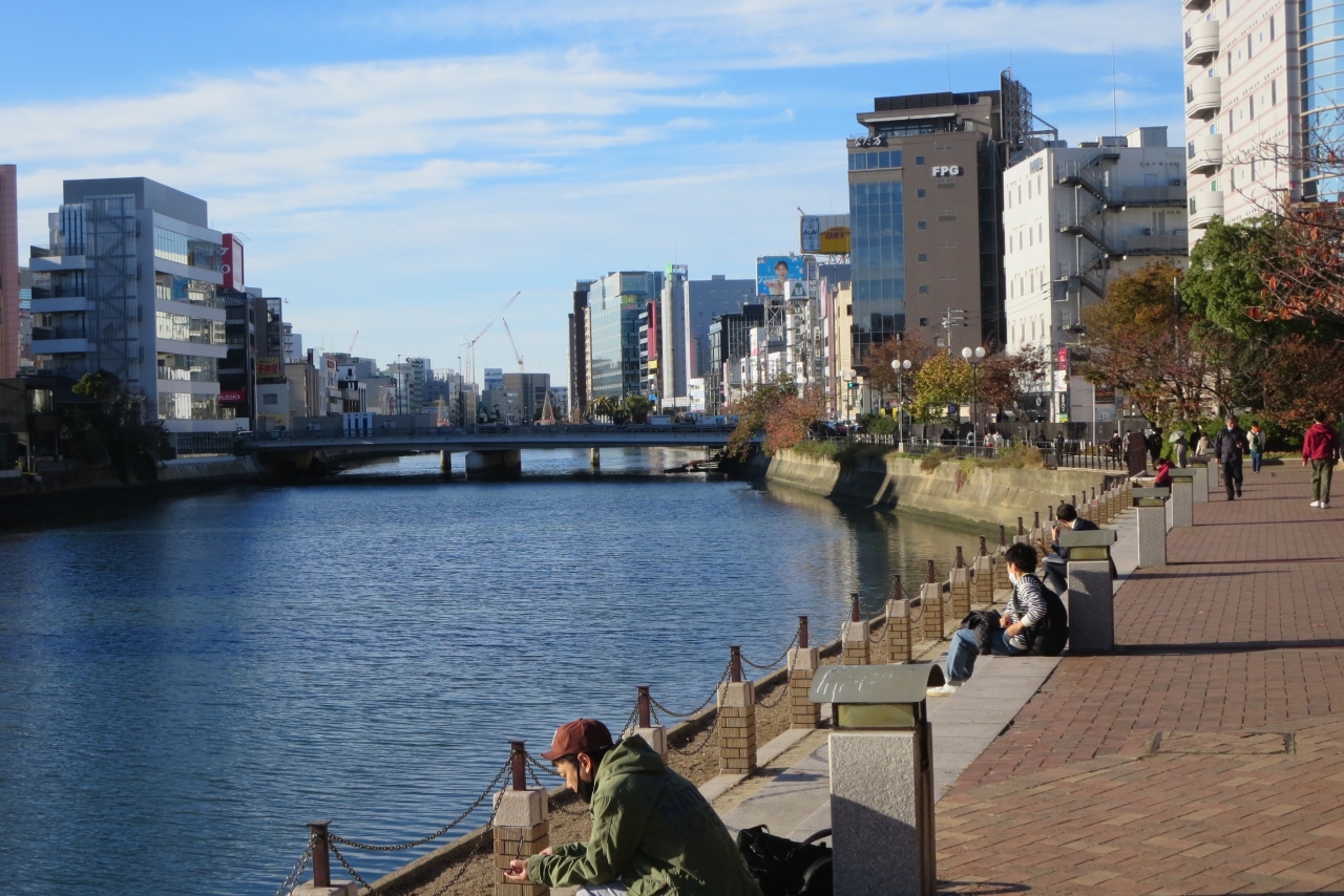 那珂川はキャナルシティの手前で川は二つに別れ1㎞ほど下流でまた合流します。この二つの川に挟まれた地域が九州一の歓楽街中洲です。海に非常に近いので潮の干満に影響され、干潮時には川の底が見えるくらいになっています。また福博であい橋のたもとからは、那珂川水上バスに乗って中洲クルーズや博多湾クルーズが楽しめます。夜景のきれいなスポットでもあります。