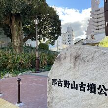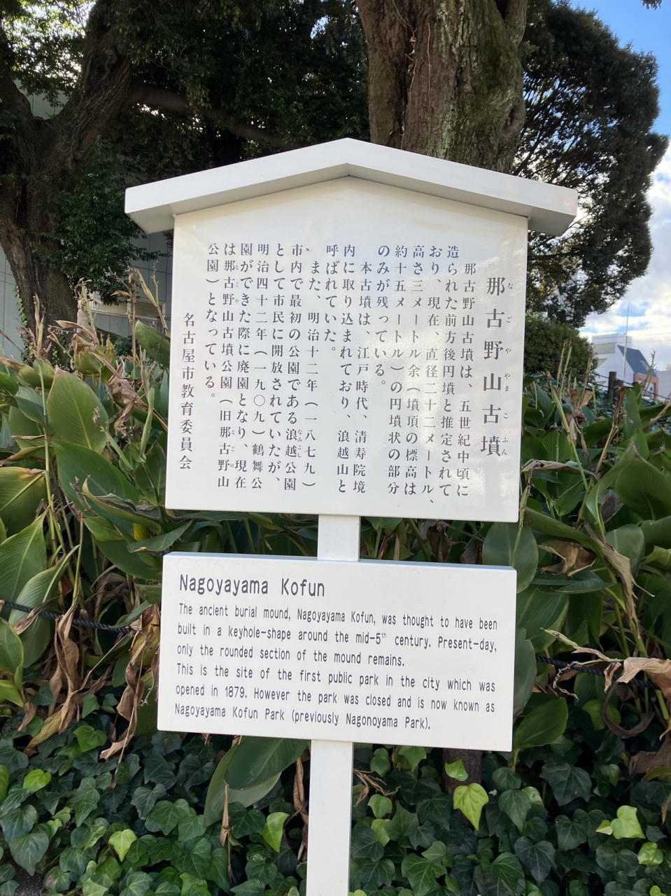 名古屋市地下鉄「大須観音駅」から徒歩で5分ほどです。賑やかな「大須商店街」から一筋入ったところにあります。5世紀中~後半に造成されたと思われる前方後円墳です。前方は壊され、後円部のみです。高さは3mほどで、もっこり盛り上がっている部分に登れます。園内に江戸時代に将軍家が上洛の際に飲用水として献上された「柳下水」のモニュメントもありました。