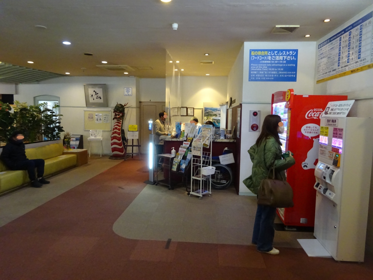 長崎空港内には空港ターミナルと直結している専用のターミナルがありますが、時津の港には何もなくて、目の前のホテル内でチケットを買います。このホテルは船会社が経営しており、ホテルのロビーを待合室として利用できるようです。また、ホテルに泊まれば運賃が半額になったり、逆に乗船券を買ったらホテル内のレストランが割引になるなどの特典もあります。