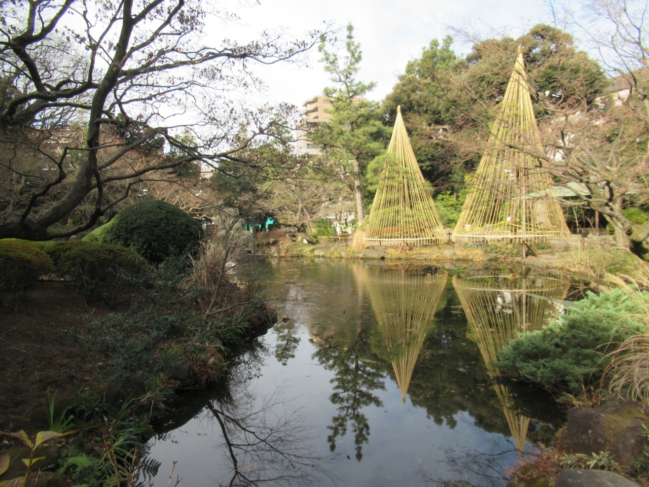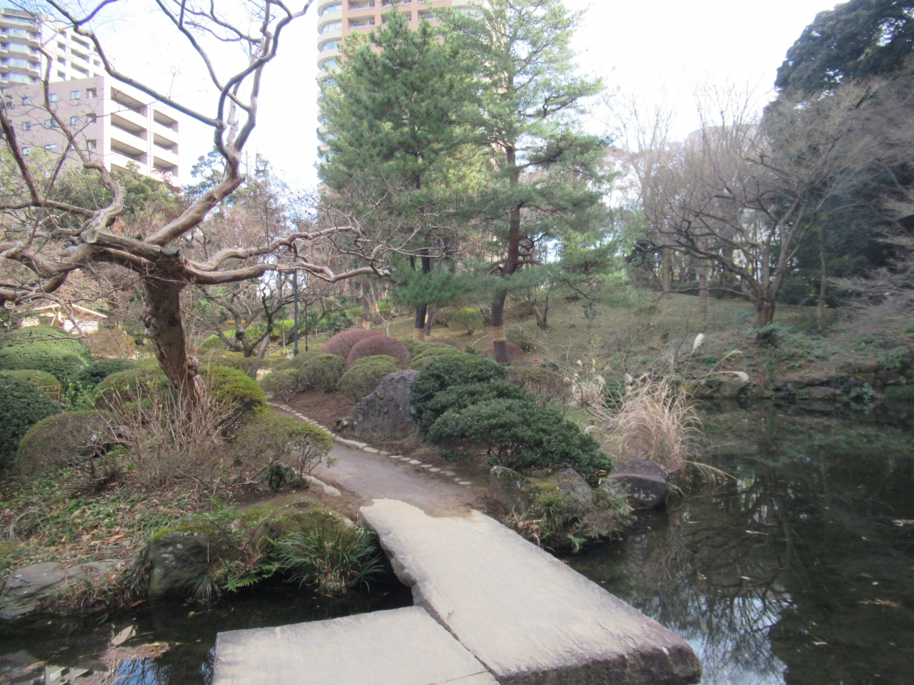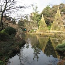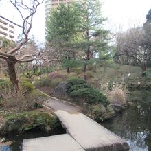 都電荒川線1日乗車券を購入して、雑司ヶ谷と早稲田の間を散策した際に再訪した、無料で入園できる庭園です。面影橋駅から2分ほどのところに造られた児童公園と日本庭園がある公園で、江戸時代、清水家の下屋敷があったところに造られています。土地の高低差を利用して造られていて、池の周りは手入れが行き届いた樹木で囲まれています。雪吊りも見られ、木道や石橋、休憩所もあり、池の周りを一周できる遊歩道も整備されています。早朝7時からオープンしている静かな庭園です。