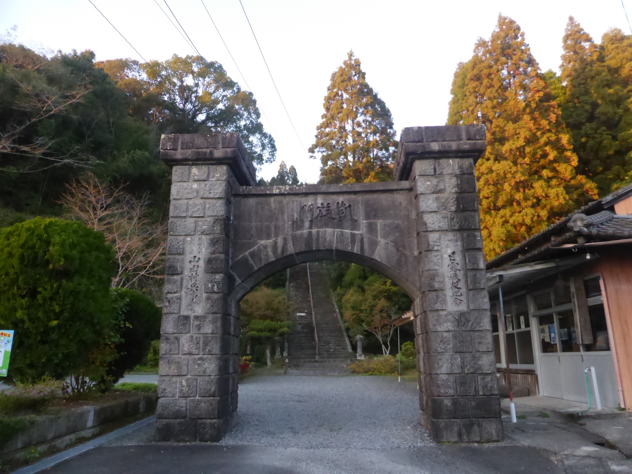 日露戦争に山田村から従軍した人たちの無事帰還を記念して、明治39年(1906年)に建設された凱旋門です。現存する日本唯一の石造凱旋門といわれ、国の登録有形文化財です。脇には詳しい説明書きも建てられています。奥には、100段ほどの石段がありを登ったところに招魂社があります。境内からは雄大な桜島が望めます。