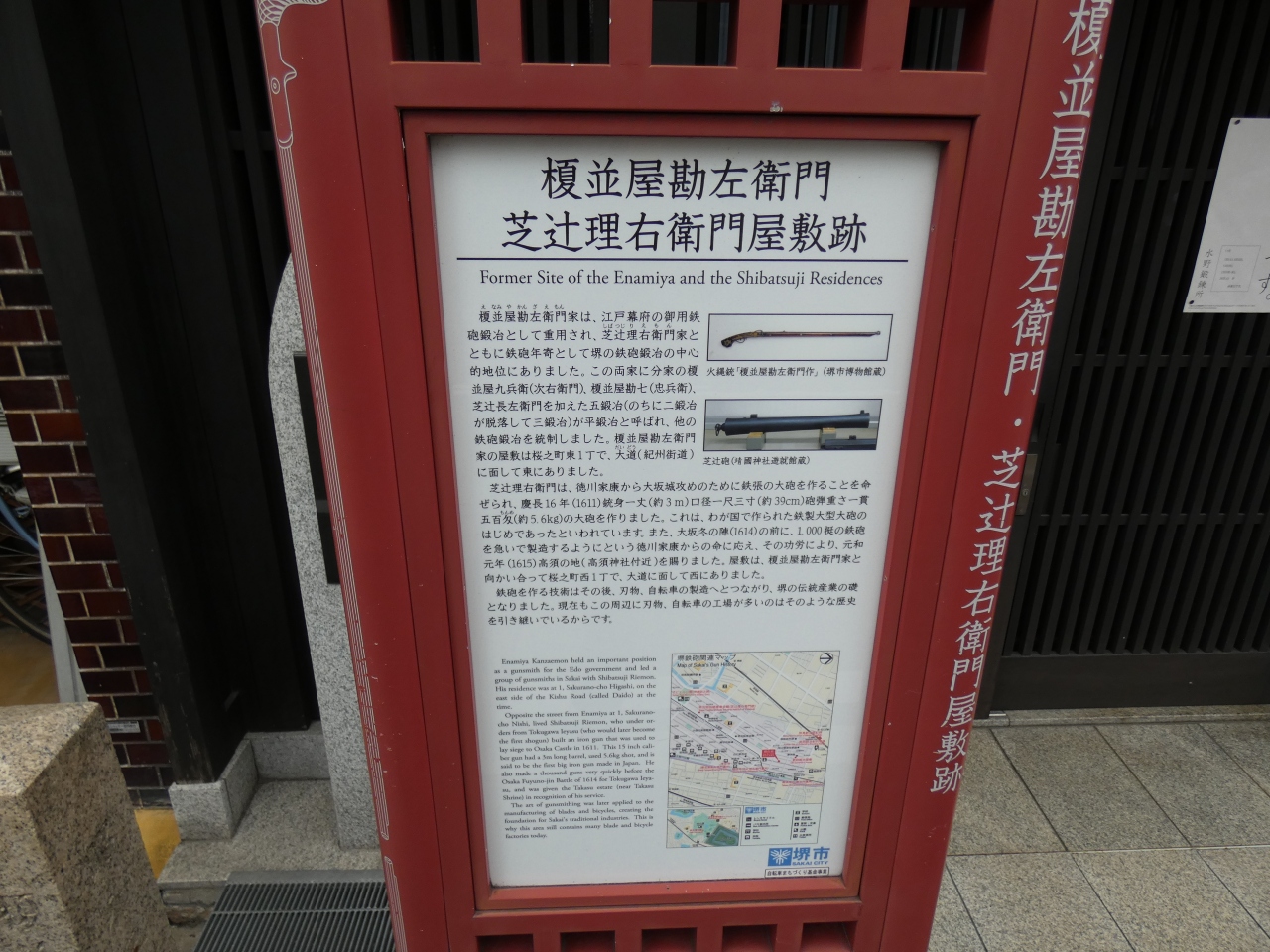 堺環濠都市北部の綾の町の紀州街道沿いに建つ鉄砲鍛冶の屋敷跡。榎並屋勘左衛門家は江戸幕府の御用鉄砲鍛冶として徴用され、芝辻理右衛門家と共に鉄砲年寄として堺の鉄砲鍛冶の中心的地位にあったようです。日本一の鉄砲生産を誇る堺の名家跡です。