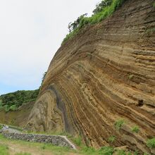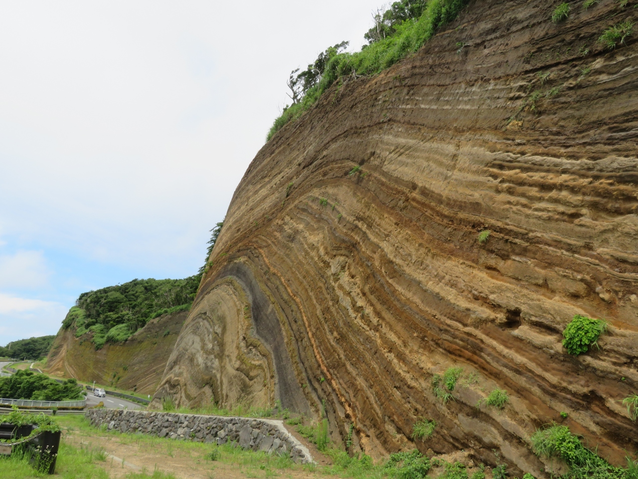 道路の建設で偶然に発見された地層だそう。大昔から火山の噴火が繰り返されているのでしょうそれを地層として見ることができるのだから圧巻です。バームクーヘンのような地層が数百メートルにわたり続いています。バス停もバームクーヘンになっているのでそれも見てみては。