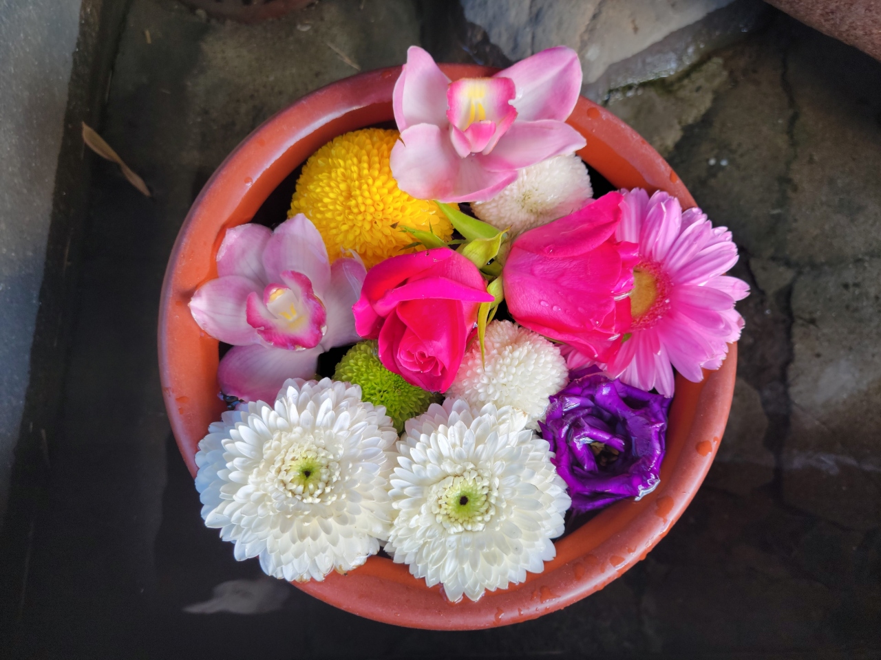 私のおすすめは「花手水」で、御手水場の四隅に小さい水盤がありお花がかわいらしくうかべてありましたが、とても癒されました。