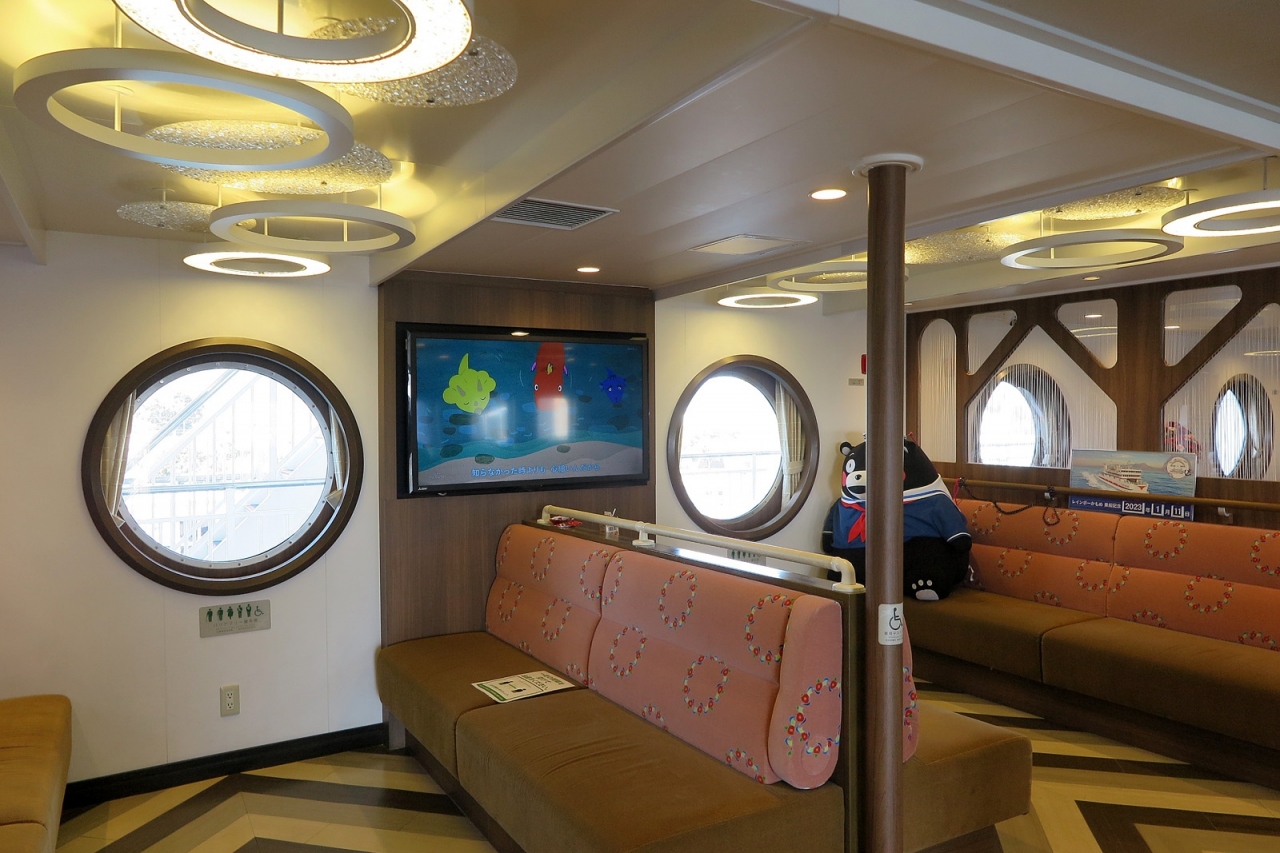 長崎市から熊本市へ向かうには電車・高速バスもありますが、料金・所要時間でいえば九商フェリーがベスト。乗換の手間がかかると考えることもできますが、フェリーはイベントとしても楽しそうと思って乗船しました。往路に搭乗したのは850トンの新造船「レインボーかもめ」でしたが、館内はとても綺麗、座席の種類も豊富、もちろん無料Wifiも使えました。波の穏やかな有明海だけあって、揺れもなくとっても快適な時間でした。下船すると無料のシャトルバスで熊本駅まで送迎を受けられますので、時間的にもロスがありませんでした。次回はフェリーを利用して島原観光を楽しみたいと思わせてもらえました。