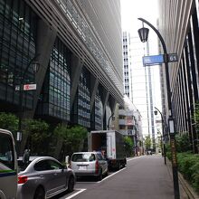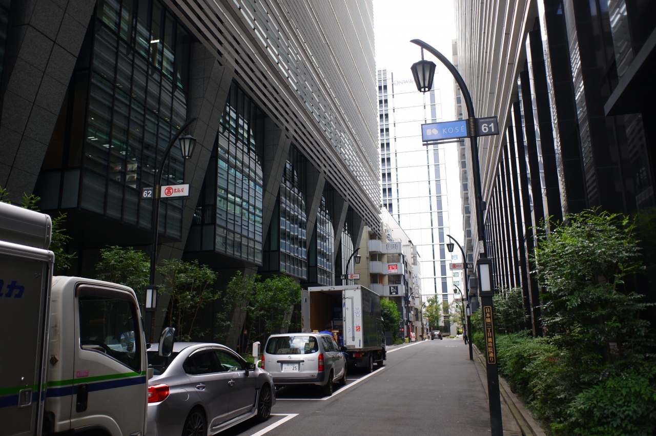 八重洲通りと平行して2本北側を走る裏通りが「養珠院通り」です。名前の由来は、この通り沿いにある「於満稲荷神社」が、家康の側室・お万の方を祀っていて、その院号が養珠院だからということです。現在の光景は都会の裏通り以外のものではなく、街路灯に「養珠院通り」と刻まれており、かろうじて通りの名前を知ることが出来ます。