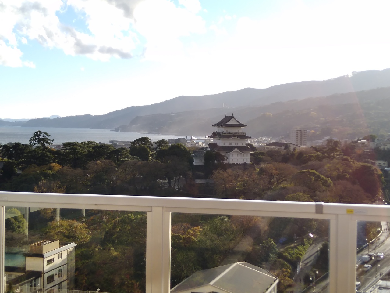 14階の屋上は無料の足湯スポットがあり、小田原の展望を楽しめます。小田原城の天守閣ものぞめました。