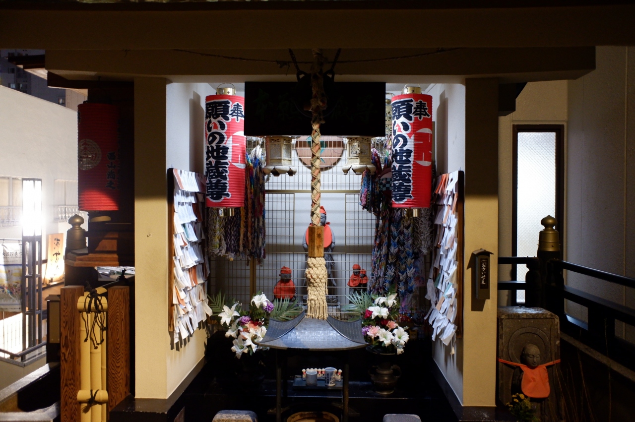 大観音寺は創建は明治13年と比較的新しいお寺です。人形町通りから伸びる参道の先の階段を登ると2階部分に本堂があります。本堂以外にも「願掛地蔵尊」「韋駄天地蔵」といった小さな社があり、愛らしいお地蔵さんの姿など、どことなく下町らしさを感じます。