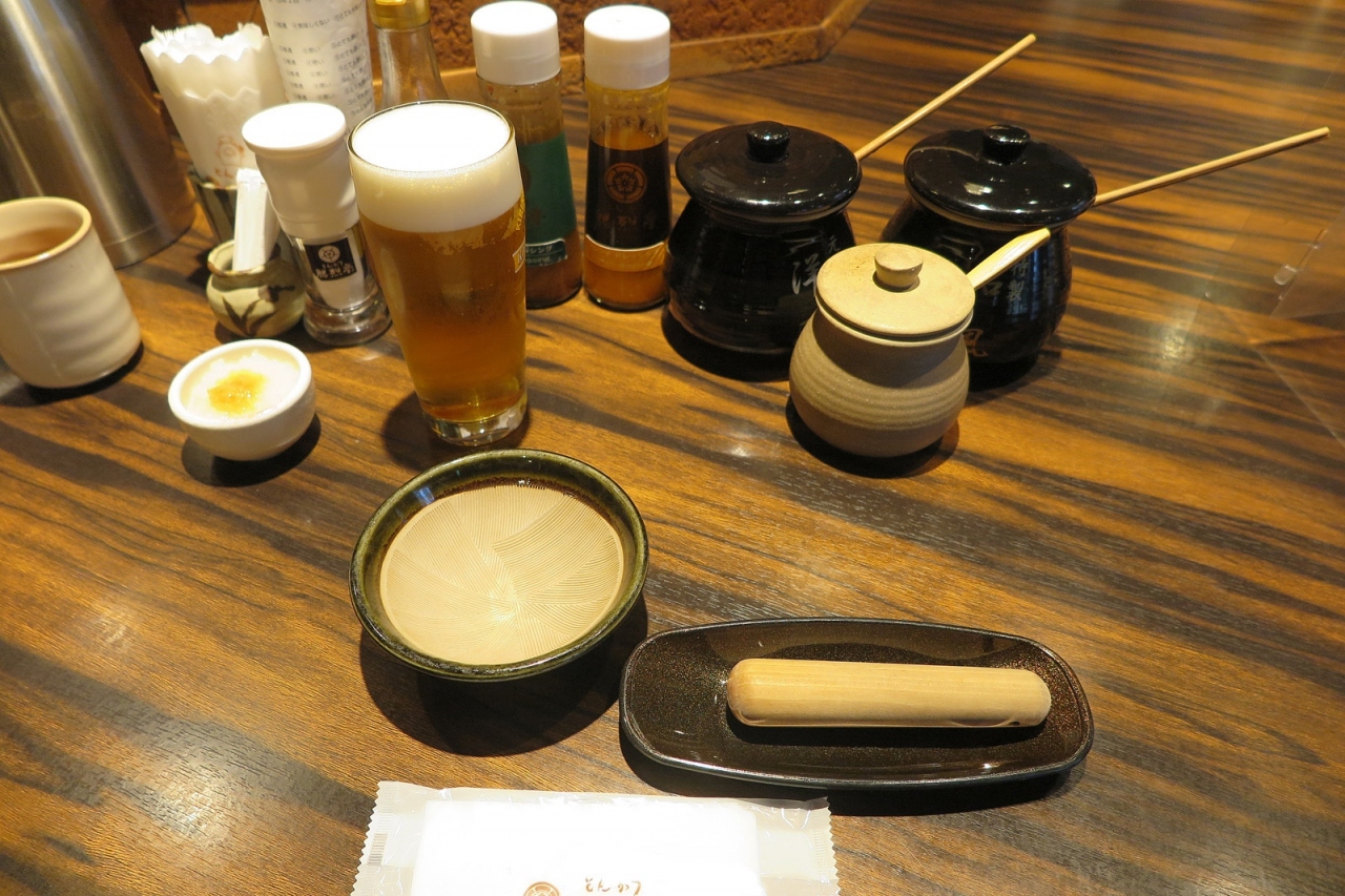 評価の高いとんかつ屋さんということで、試しに訪れてみました。今までそうして訪れたお店の多くは「まぁ、こんなものかな…」という感想を持ちましたが、このお店は期待を大きく上回るものでした。少しお洒落な店内、「ロースとひれかつ定食(1529円)」とキリン一番搾り(682円)を注文すると、まずは口直しの大根おろし、食べ放題の高菜漬(私の人生の中で最もおいしい高菜漬でした)、ゴマのすりこぎ棒もトレイ付きで到着。とんかつはもちろんおいしかったのですが、白いごはんも大変においしいものでした。接客もお客さんを待たせない姿勢がすばらしいと思いました。熊本の評価が上がりました(笑)。