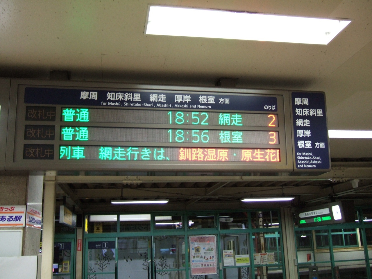夜は釧路駅を出ると一面の闇の中を走り、人家の明かりは数えるほど。釧路発18時52分の次は22時9分発の摩周行き最終列車しかなく、車内も空いていました。