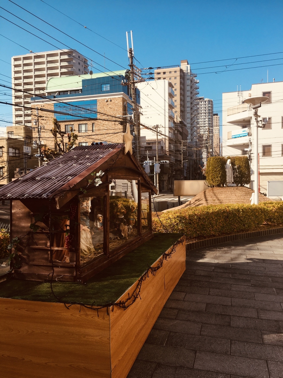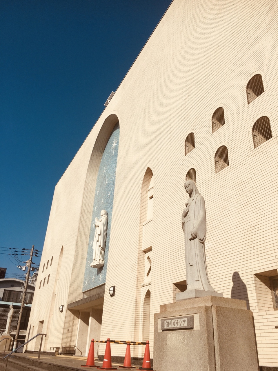 敷地内には大司教館や駐車場もありました。高山右近、細川ガラシャ、羊飼いの像等もありました。建物内も広くパイプ椅子がたくさん置かれて信者が牧師の話を聞いていました。三角形の小屋があり、等と動物の人がありました。