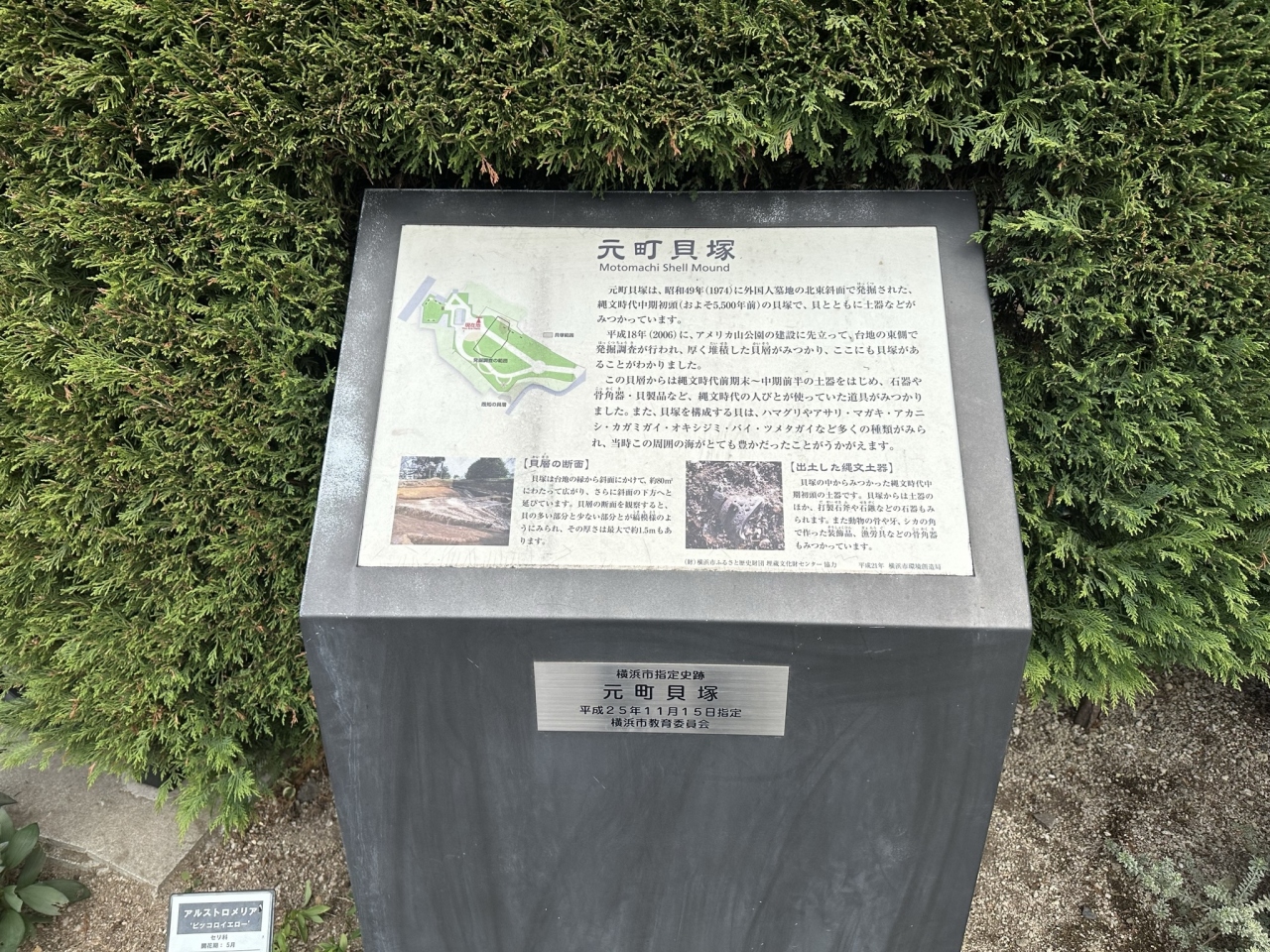 元町通り沿い、みなとみらい線の元町・中華街駅の入口があるビルの4階に、アメリカ山公園の入口があり、この入口近くに元町貝塚の碑と説明書きがあります。説明書きには、アメリカ山公園で発掘調査が行われた範囲や、発掘当時の写真などが併せて描かれています。