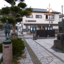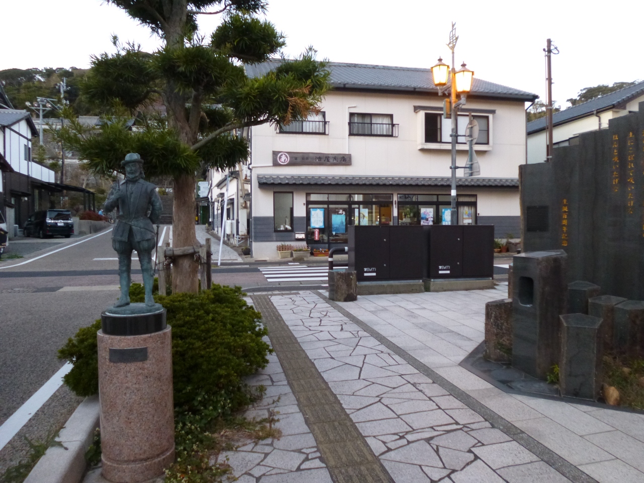 平戸港から平戸港交流広場から、松浦史料博物館に向かう通りが歴史の道です。私たちは松浦史料博物館から平戸港へ向かったので、高台の階段から海へまっすぐ伸びる石畳の道が印象的です。通り沿いには平戸に縁がある人達の銅像が右手を上げて並んでいます。