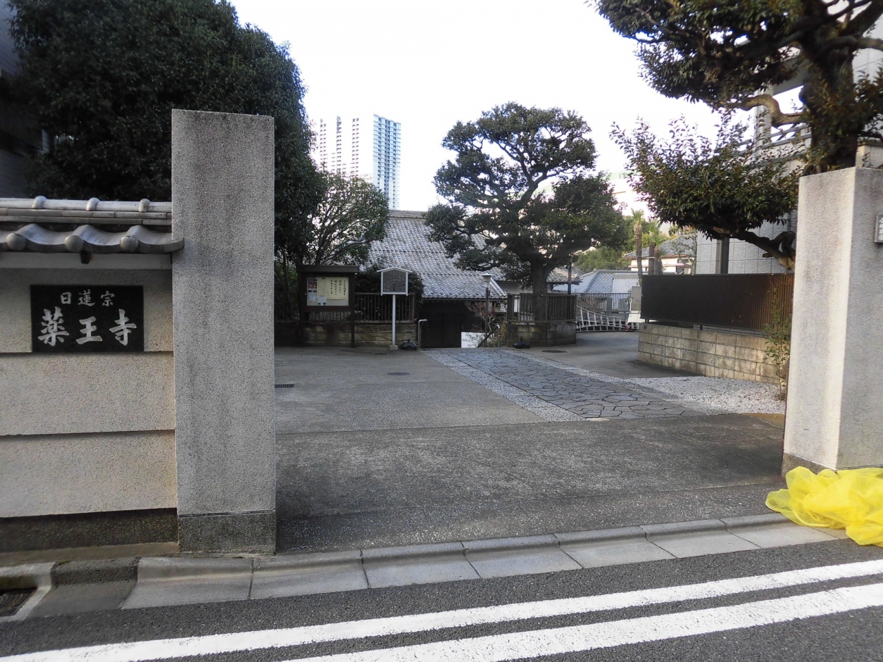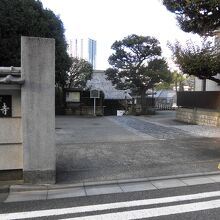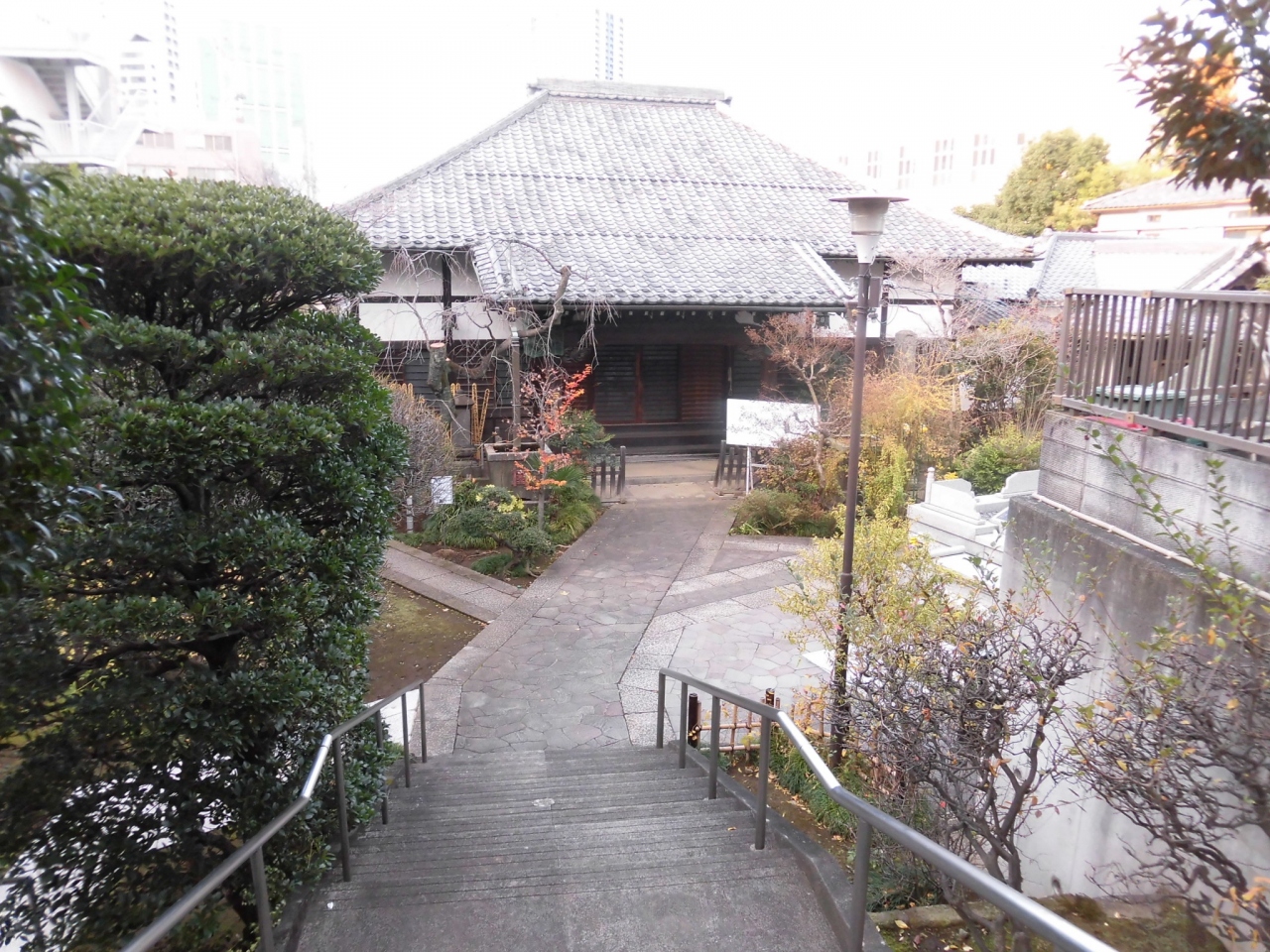 港区三田の魚籃坂から聖阪周辺にあるお寺巡りをしていた時に立ち寄ったお寺です。寺門などははなくて瓦屋根の塀に門柱がある日蓮宗の寺院でした。境内に入ると、本堂は少し下がった場所に建てられていて、ゆるやかな階段を降りることになります。本堂の周りの植木が良く手入れされているので、樹木に花が咲く時期はきれいだろうと思いました。