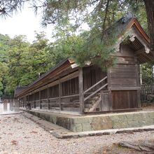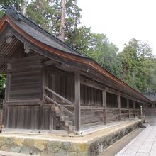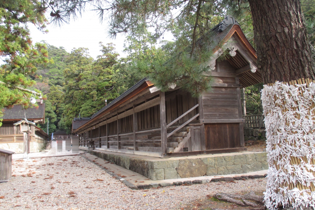 末社 十九社は、瑞垣の外、本殿の左右(東西)に相対して2棟ありました。それぞれ、19の部屋が連なっていることからこの名が付いている様です。ここは神在祭で全国から集まってきた八百万神が宿泊するホテルです。東西合わせても38室しかありませんから、大勢の相部屋になり結構な混み具合なのかと思います。なお、神在祭以外の時は、全国各地の神々の遙拝所となっているのだそうです。